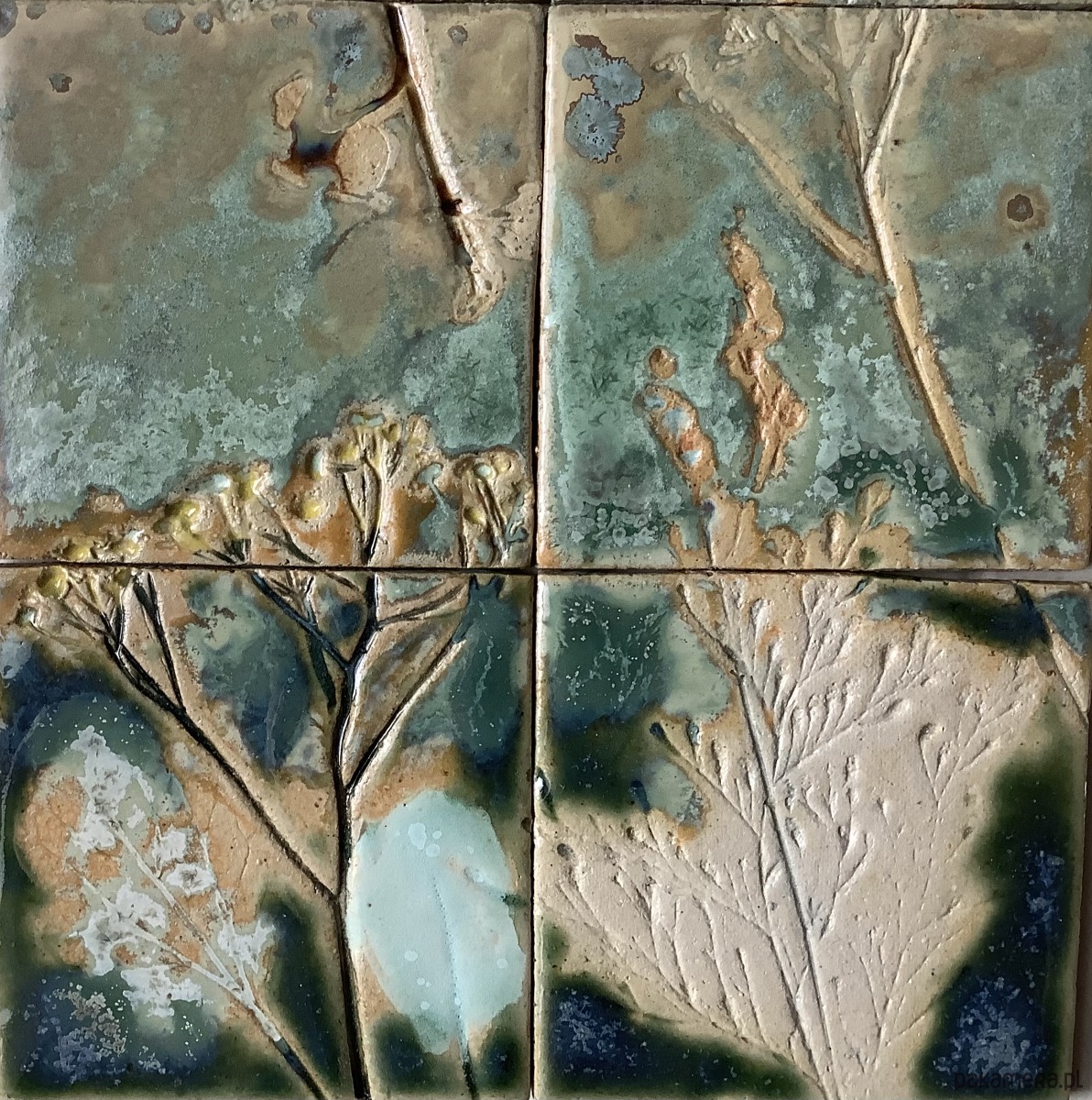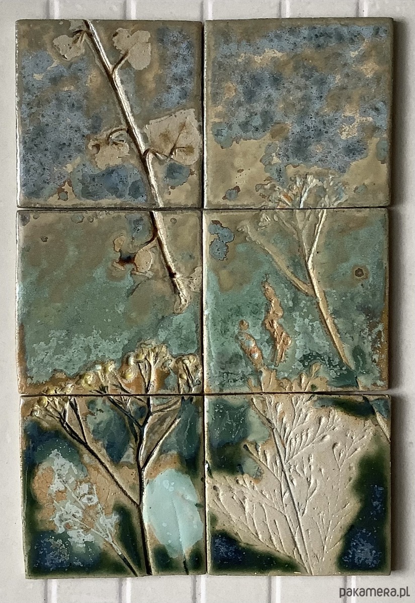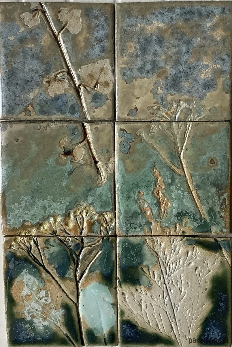 Kafle wykonane ręcznie z jasnej gliny szamotowej. Zestaw składa się z 6 płytek ozdobionych odciskami roślin. Kafle poszkliwione satynowym szkliwem w odcieniu ciemnej zieleni, zieleni i niebieskiego z efektem kryształowych plam. Kwiaty poszkliwione na zielono. Zestaw w rozmiarze 28 x 18,5 cm. Grubość około 6 mm.