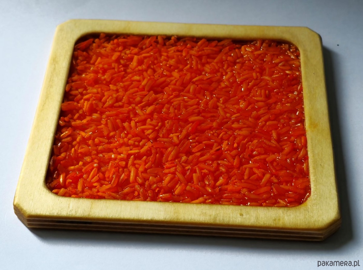 Panel sensoryczny "Ryżowe" tworzy naturalny ryż, zabarwiony jadalnym barwnikiem spożywczym. Ma właściwosci sensoryczne i przyciąga wzrok maluszka.