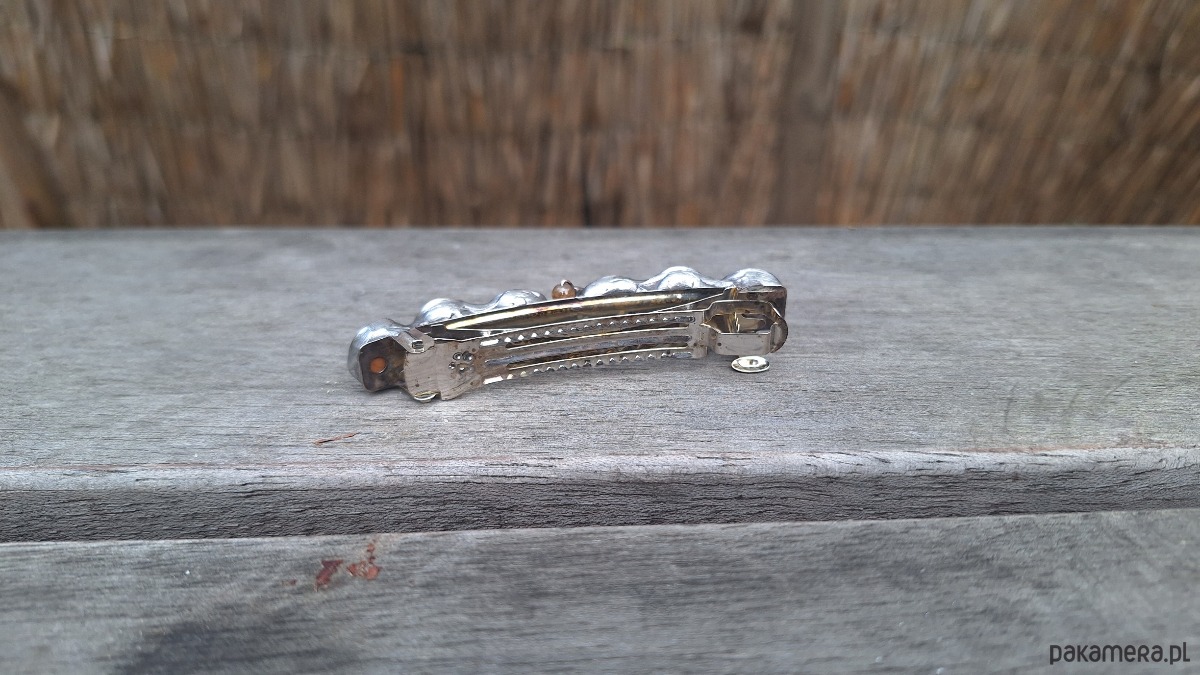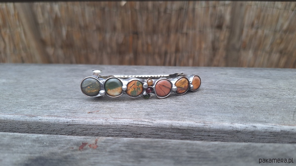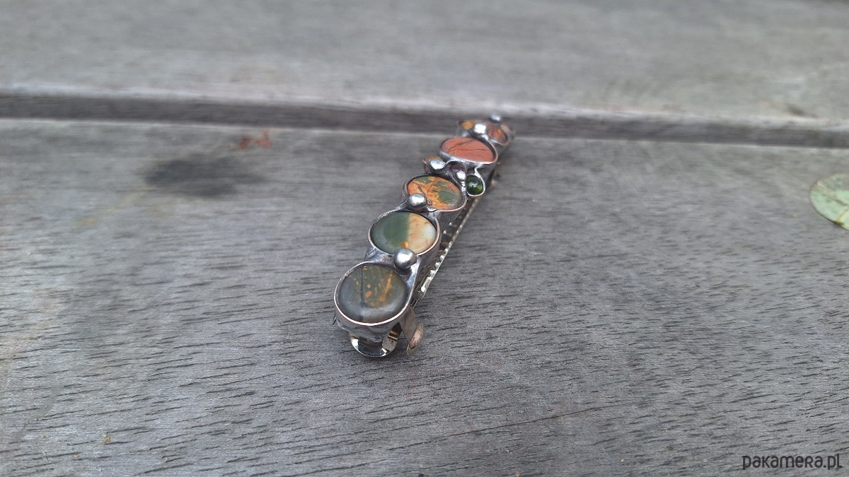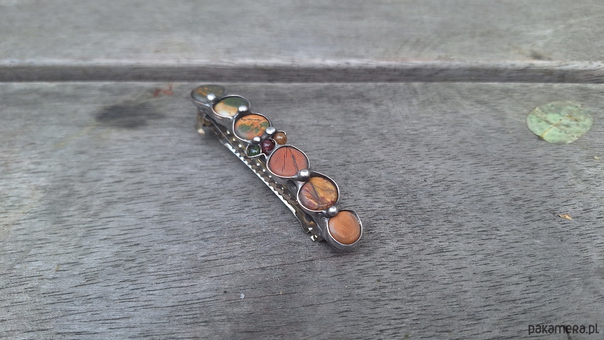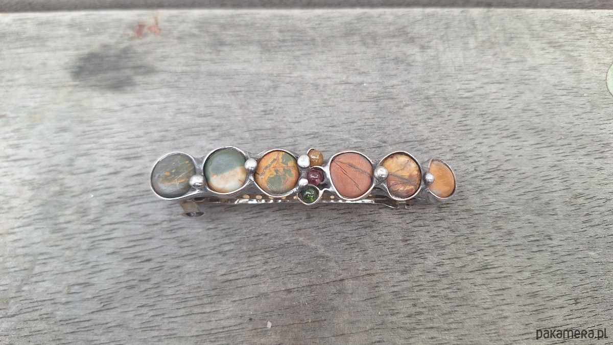 Klamra do włosów, wykonana z miedzi, cyny, jaspisów i turmalinów. Wymiary ok. 8 na 1 cm. Zapięcie 6 cm, metalowe.