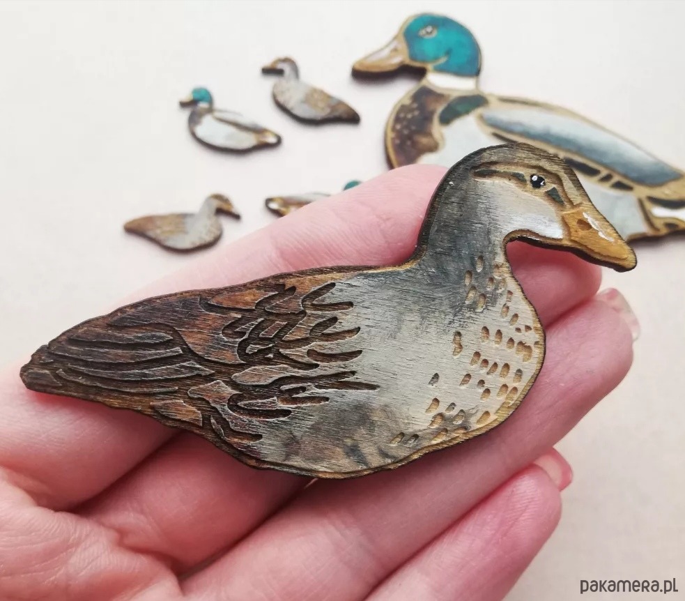 Broszka wykonana na podstawie autorskiego rysunku. Zrobiona z drewna, ręcznie malowana , a następnie lakierowane. Każda będzie niepowtarzalna. Wielkość ok 5cm.