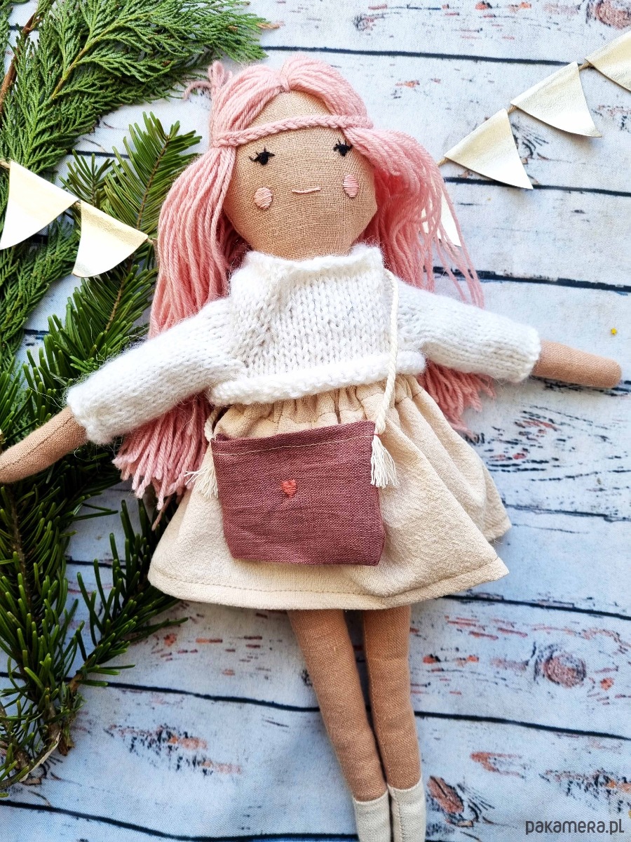 Lala jest uszyta z najwyższej jakości materiałów polskiej produkcji, sama lala jest uszyta z miękkiego lnu a ubranka z lnu, muślinu i weluru. Kolory mogą się troszkę różnić od tych na zdjęciu.