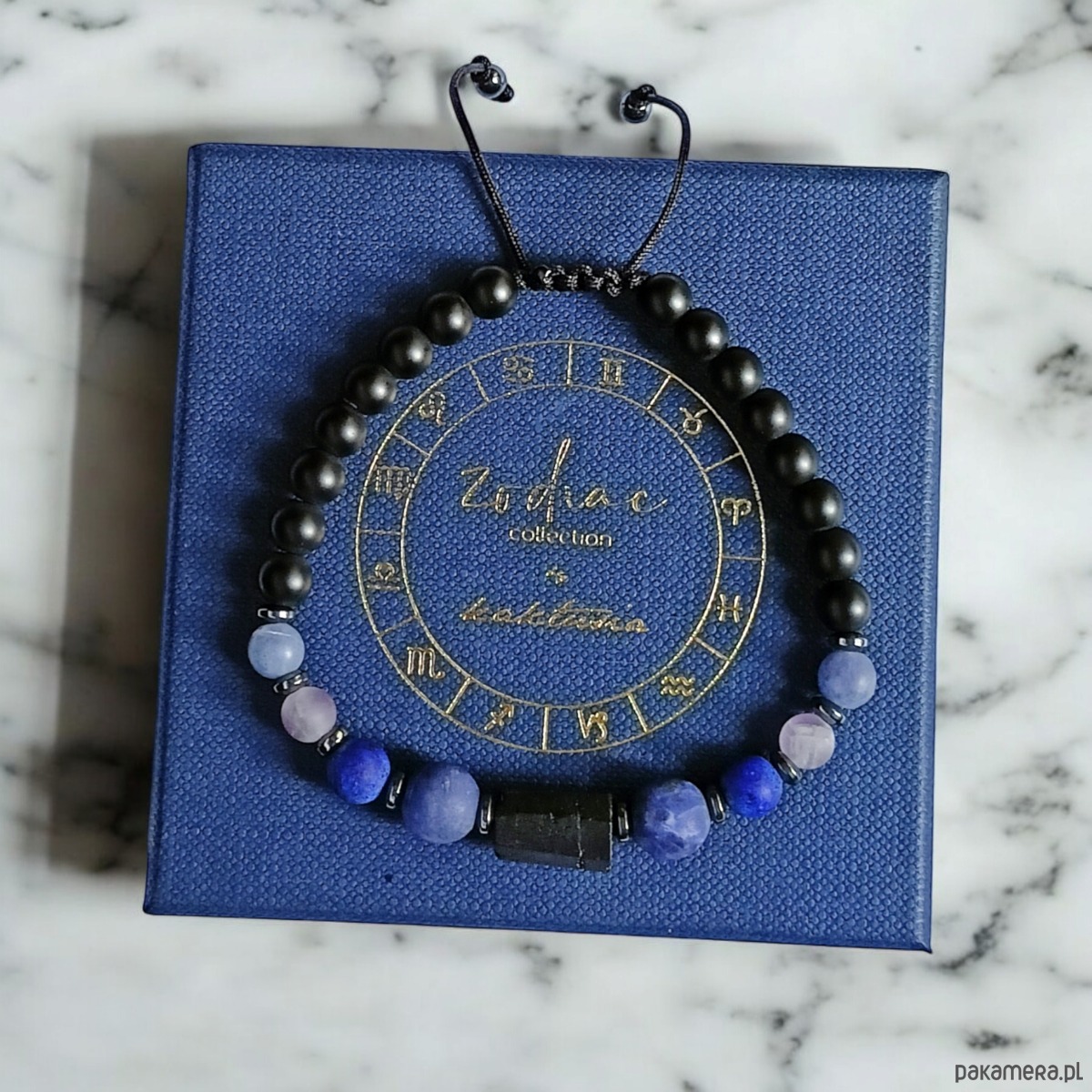 TUTAJ: Bransoletka na solidnym sznurku nylonowym, wykonana z: surowej bryłki czarnego turmalinu, matowego onyksu, sodalitu (8,5 i 6mm), ametystu i lapisu 6mm, przekładek z hematytu.