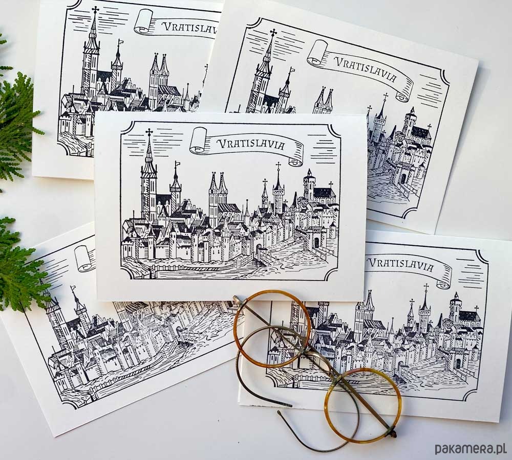 Panorama dawnego Wrocławia - pięć kart okolicznościowych z ręcznym nadrukiem w zestawie z kopertami