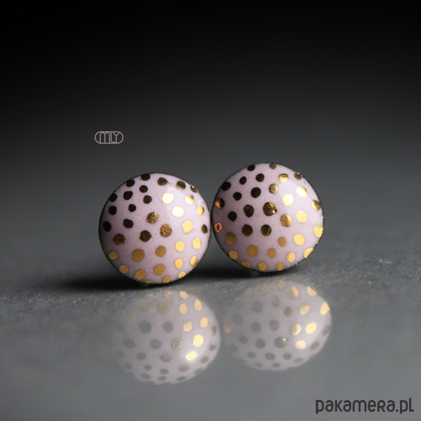 Ceramiczne okrągłe kolczyki w formie sztyftów, ręcznie wykonane z delikatnej gliny kamionkowej jednostronnie szkliwione złoto różowym szkliwem z efektem plamek i pięknym połyskiem, na antyalergicznych sztyftach w kolorze srebrnym. Średnica ok. 14mm. Polecam