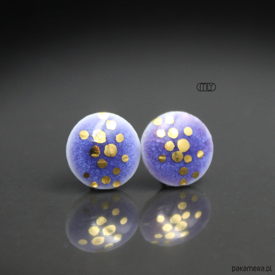 Ceramiczne okrągłe kolczyki, ręcznie wykonane z delikatnej porcelany, jednostronnie szkliwione fioletowym błyszczącym szkliwem, dekorowane kalką ceramiczną z dodatkiem złota,na antyalergicznych sztyftach w kolorze srebrnym. Średnica ok. 9mm. Polecam