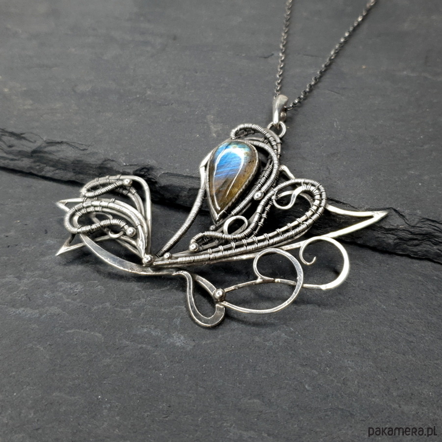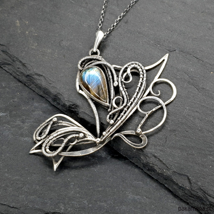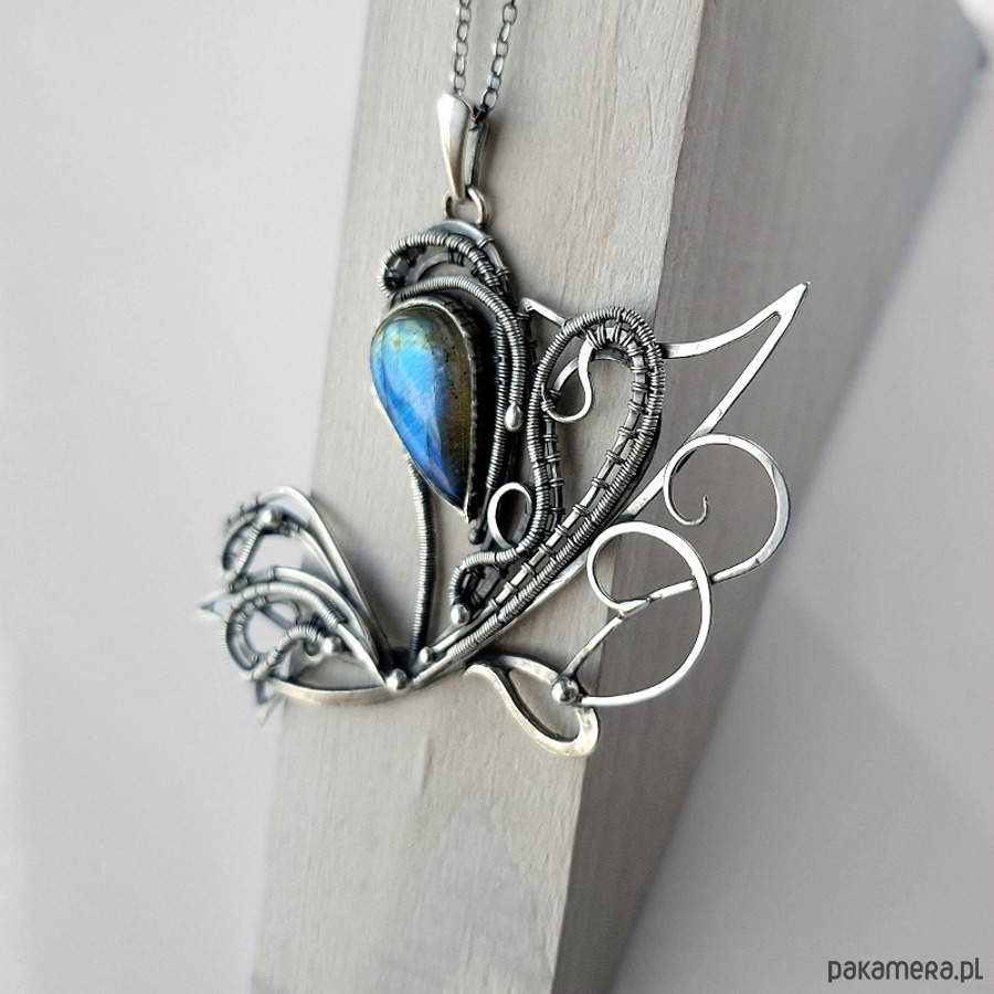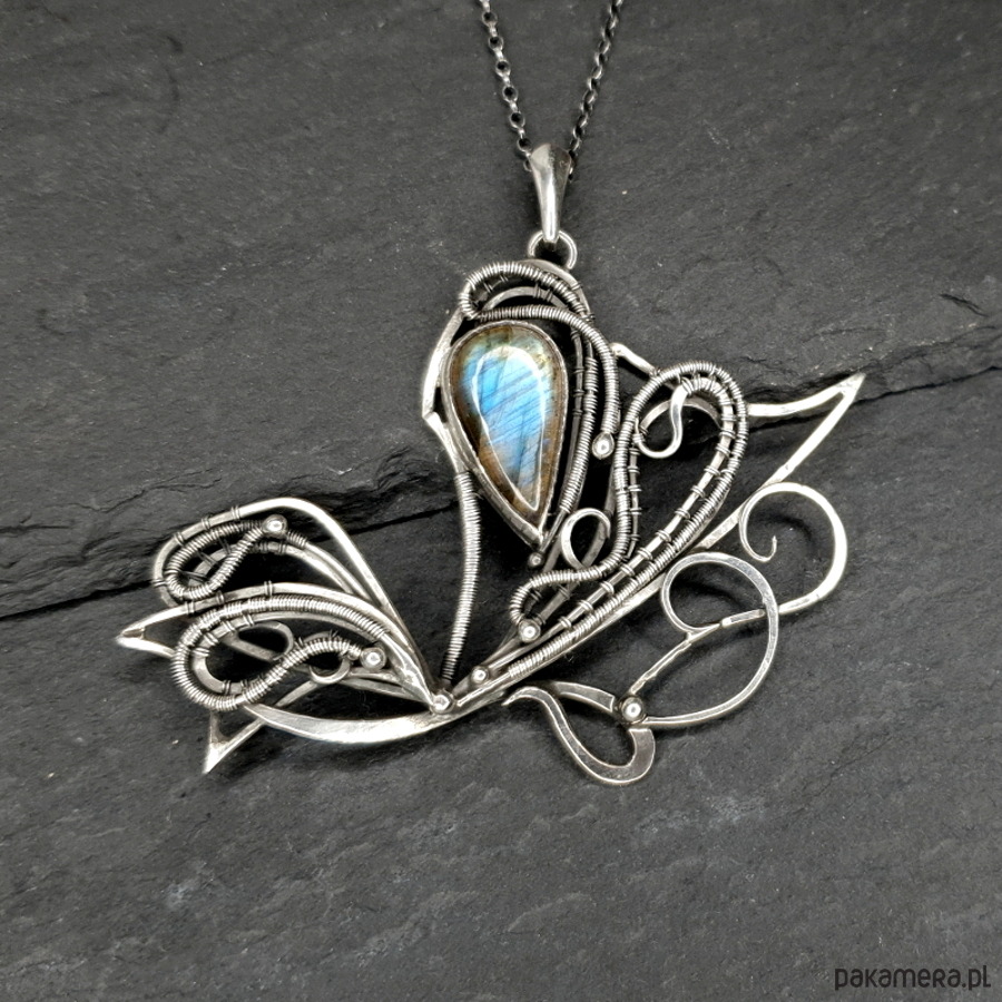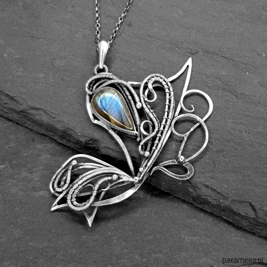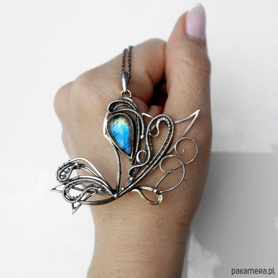 Baśniowy, misterny, naszyjnik wykonany w całości ręcznie, wyplatany w pracochłonnej technice wire wrapping. Wisior naszyjnika został wykonany ze srebra próby 930 i 999. Ażurowy motyl wyplatany ręcznie ze srebra został ozdobiony kaboszonem labradorytu mieniącego się błękitnym ogniem. Wymiary motyla to 7,5x5,3cm w najszerszym miejscu, długość łańcuszka ok 55cm. Naszyjnik został mocno zoksydowany i wypolerowany. Biżuteria zostanie ozdobnie zapakowana.