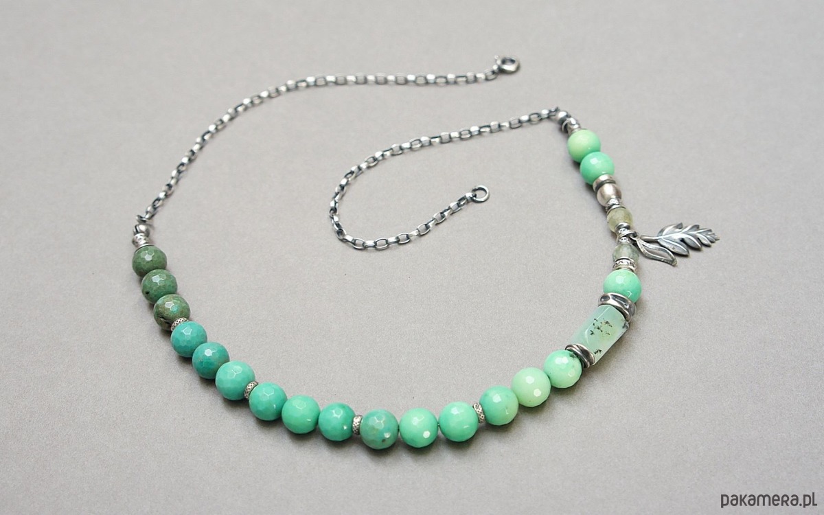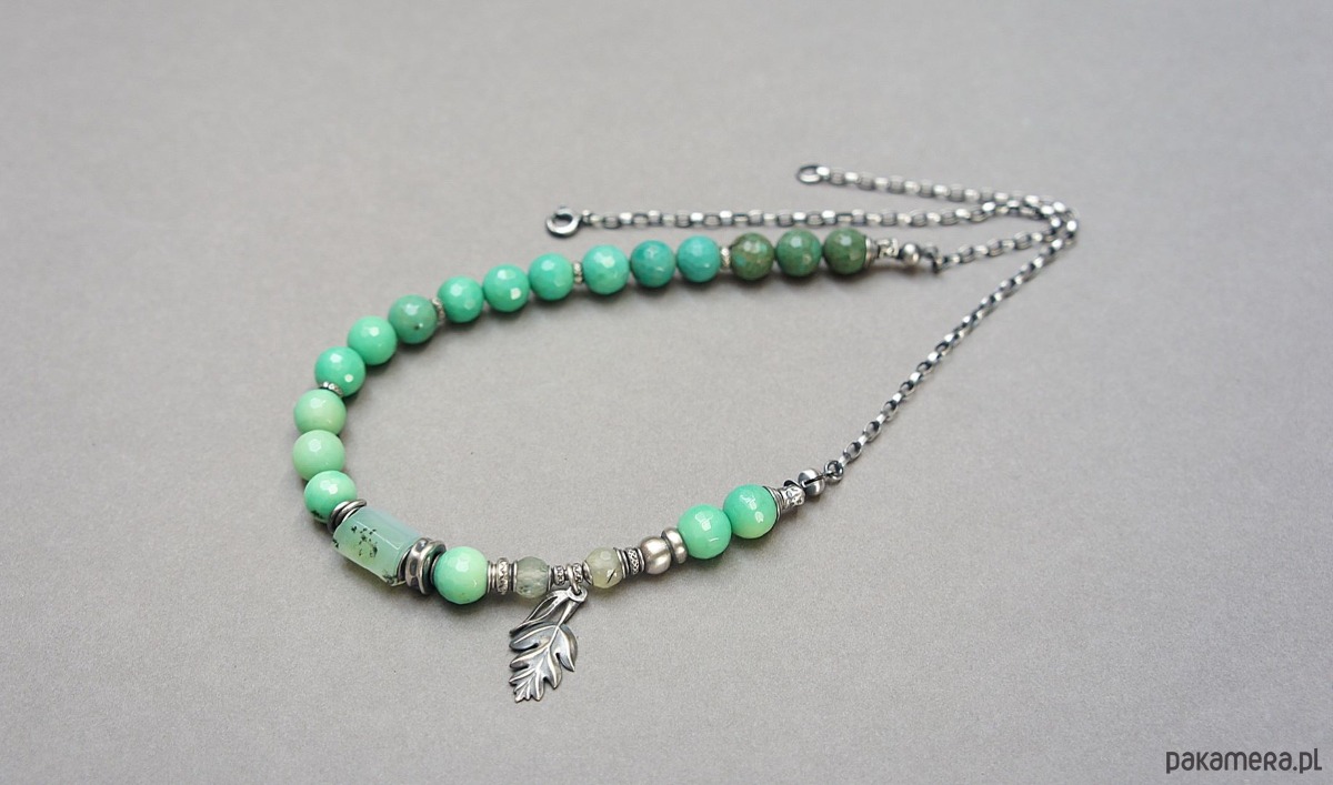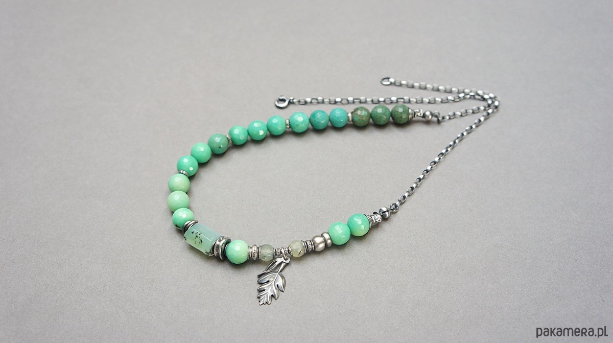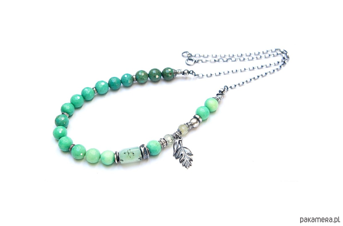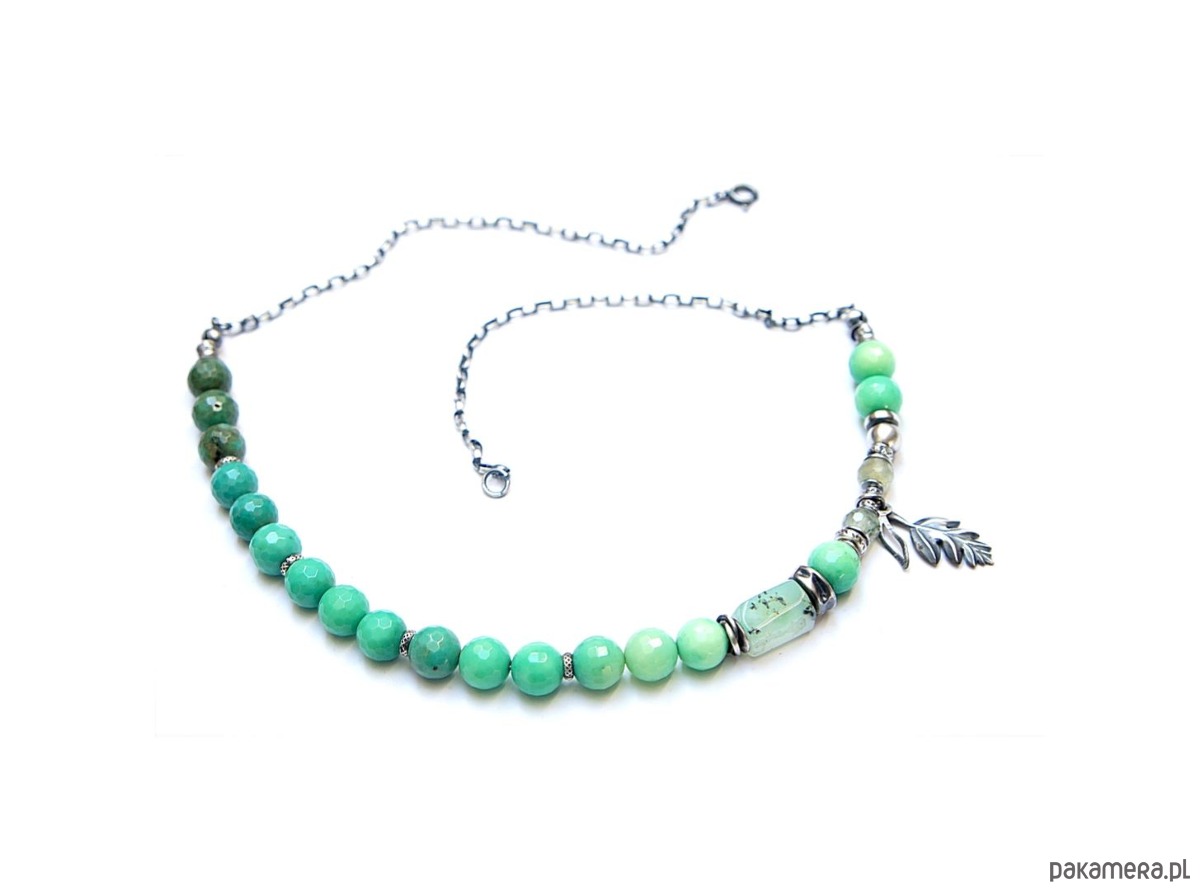 Naszyjnik wykonany ze srebra [pr. 925] w połączeniu z fasetowanymi kuleczkami chryzoprazu [8mm], fasetowanymi kuleczkami frenitu [6mm],nieforemnym wałeczkiem chryzoprazu [12mm] oraz srebrnymi przekładkami i zawieszkami. Całość oksydowana i przetarta. Całkowita długość naszyjnika 49. Biżuteria ozdobnie zapakowana .