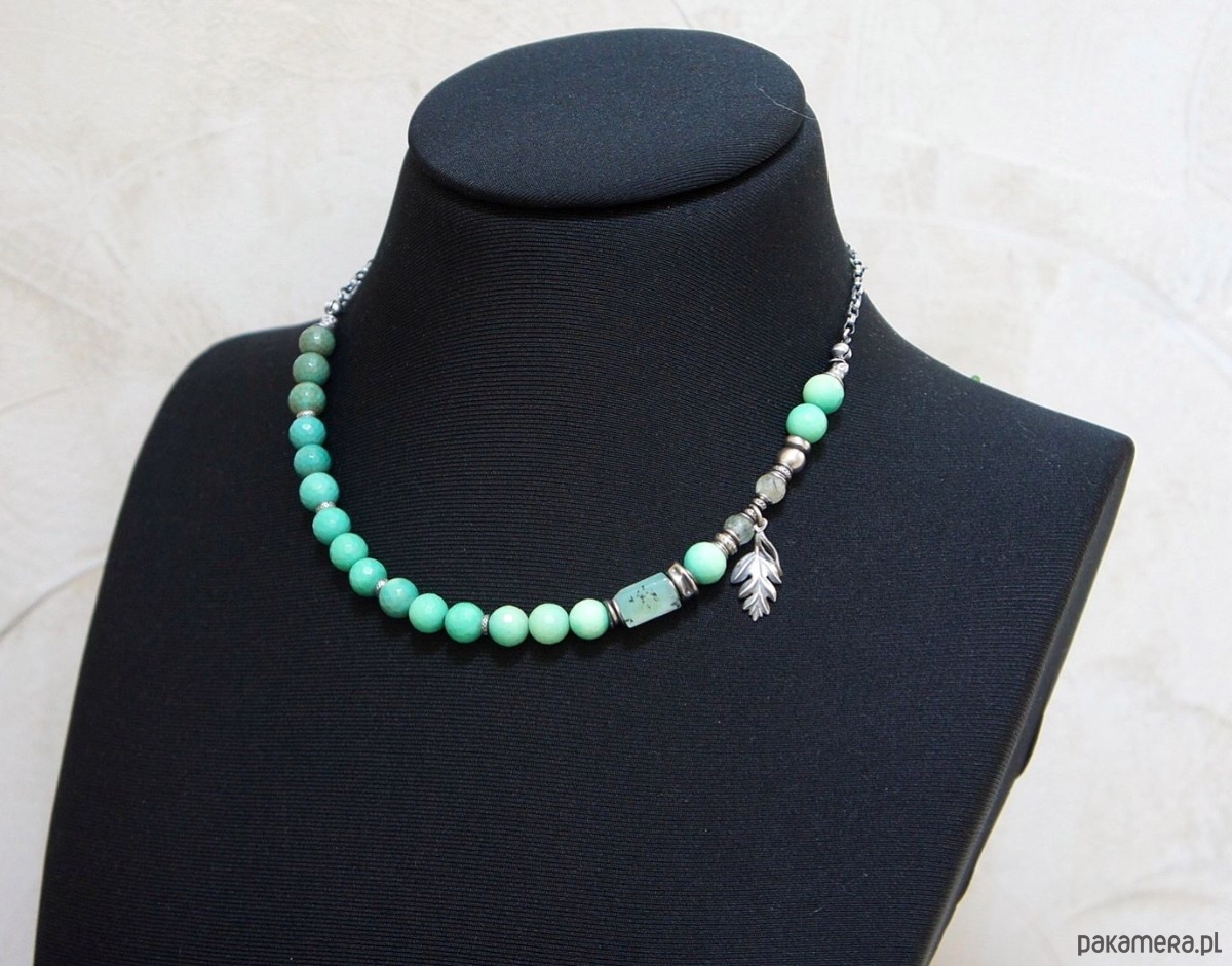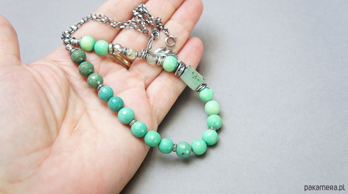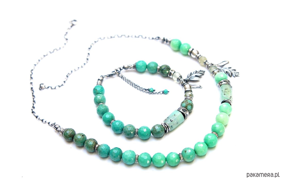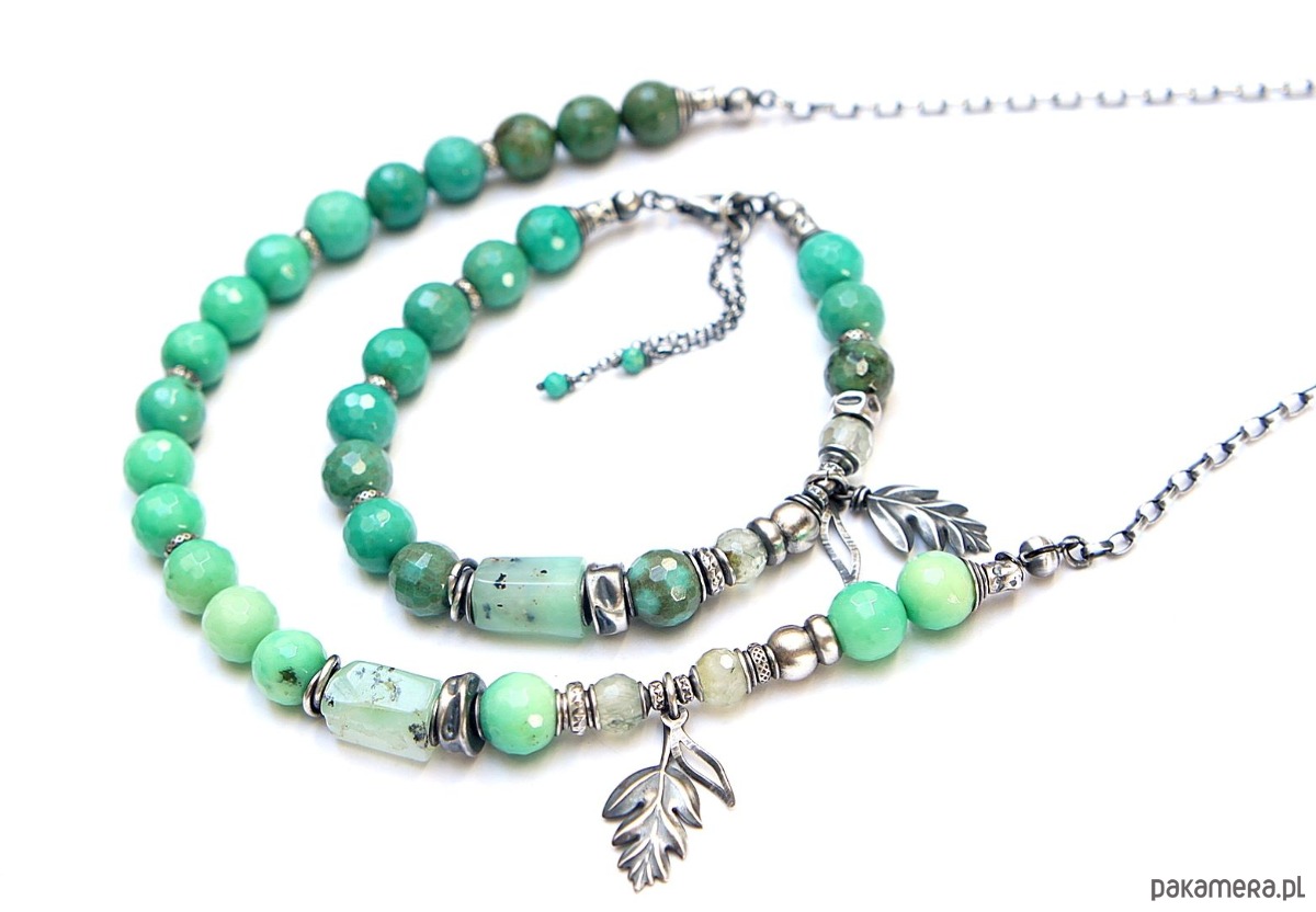 Naszyjnik wykonany ze srebra [pr. 925] w połączeniu z fasetowanymi kuleczkami chryzoprazu [8mm], fasetowanymi kuleczkami frenitu [6mm],nieforemnym wałeczkiem chryzoprazu [12mm] oraz srebrnymi przekładkami i zawieszkami. Całość oksydowana i przetarta. Całkowita długość naszyjnika 49. Biżuteria ozdobnie zapakowana .