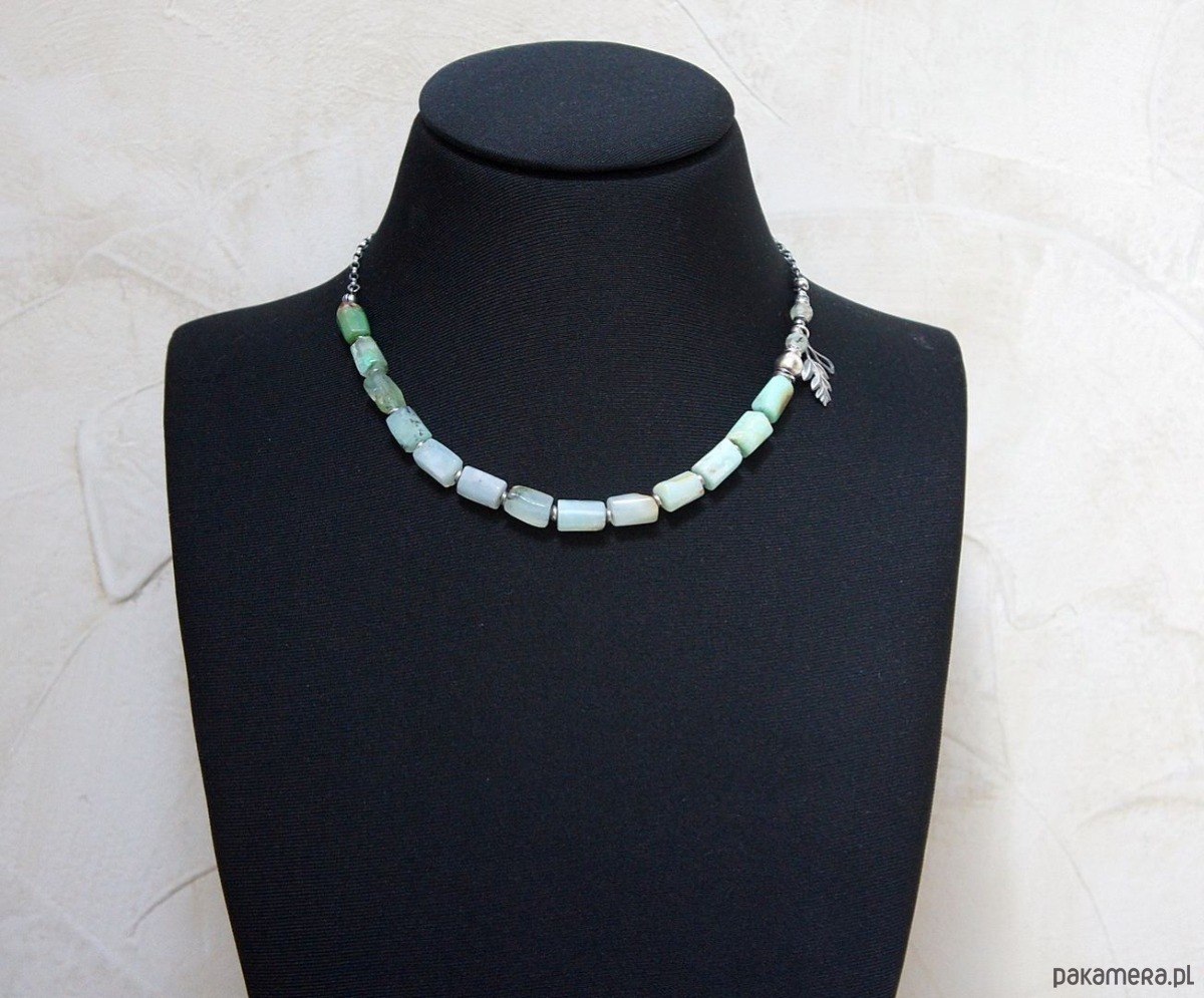 Naszyjnik wykonany ze srebra [pr. 925] w połączeniu z fasetowanymi wałeczkami chryzoprazu - naturalne niedoskonałości [10mm -12mm], fasetowanymi kuleczkami frenitu [6mm] ,nieforemnym wałeczkiem chryzoprazu [12mm] oraz srebrnymi przekładkami i zawieszkami . Całość oksydowana i przetarta. Całkowita długość naszyjnika 55,5. Biżuteria ozdobnie zapakowana .