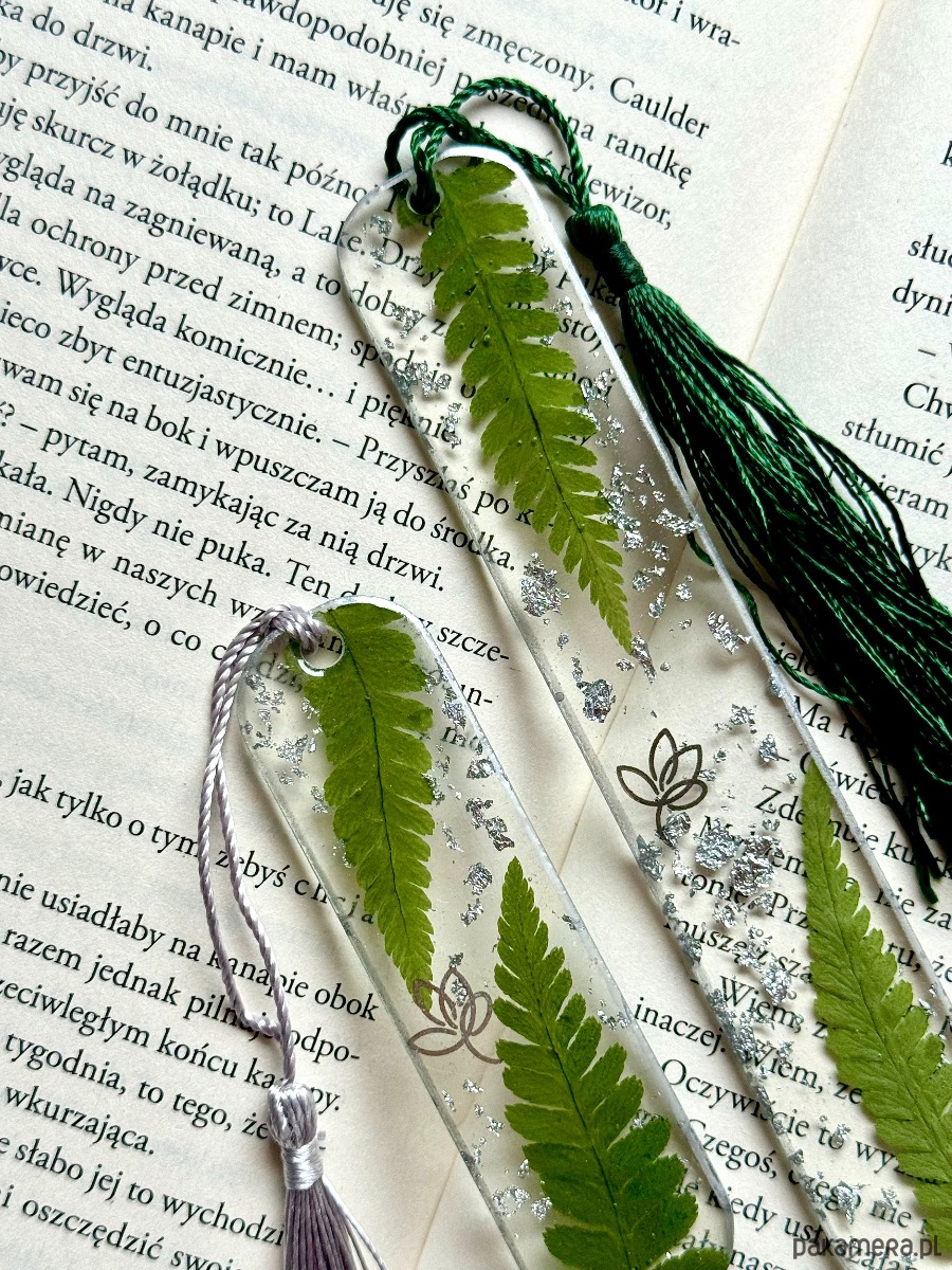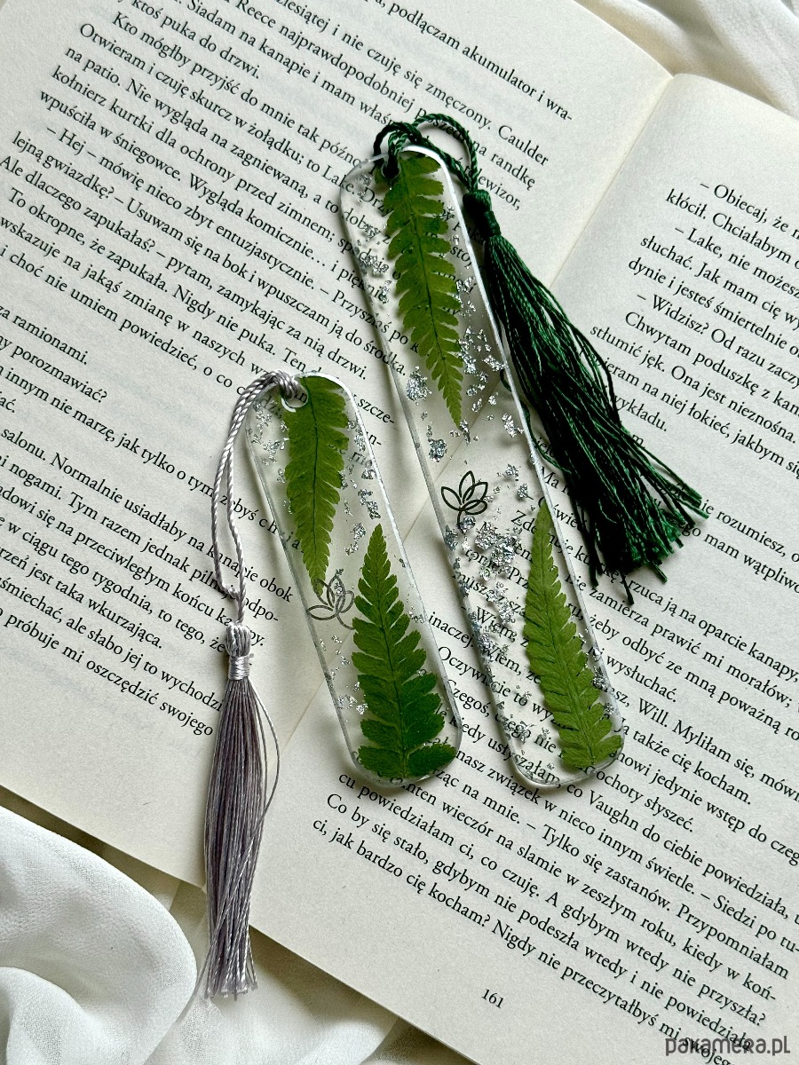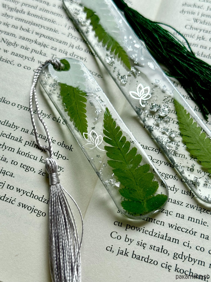 Zakładka do książki z żywicy epoksydowej, w której znajdują się suszone listki paprotki ♡ z nią Twoja lektura nabierze leśnego wydźwięku, a srebro doda trochę magii ✿