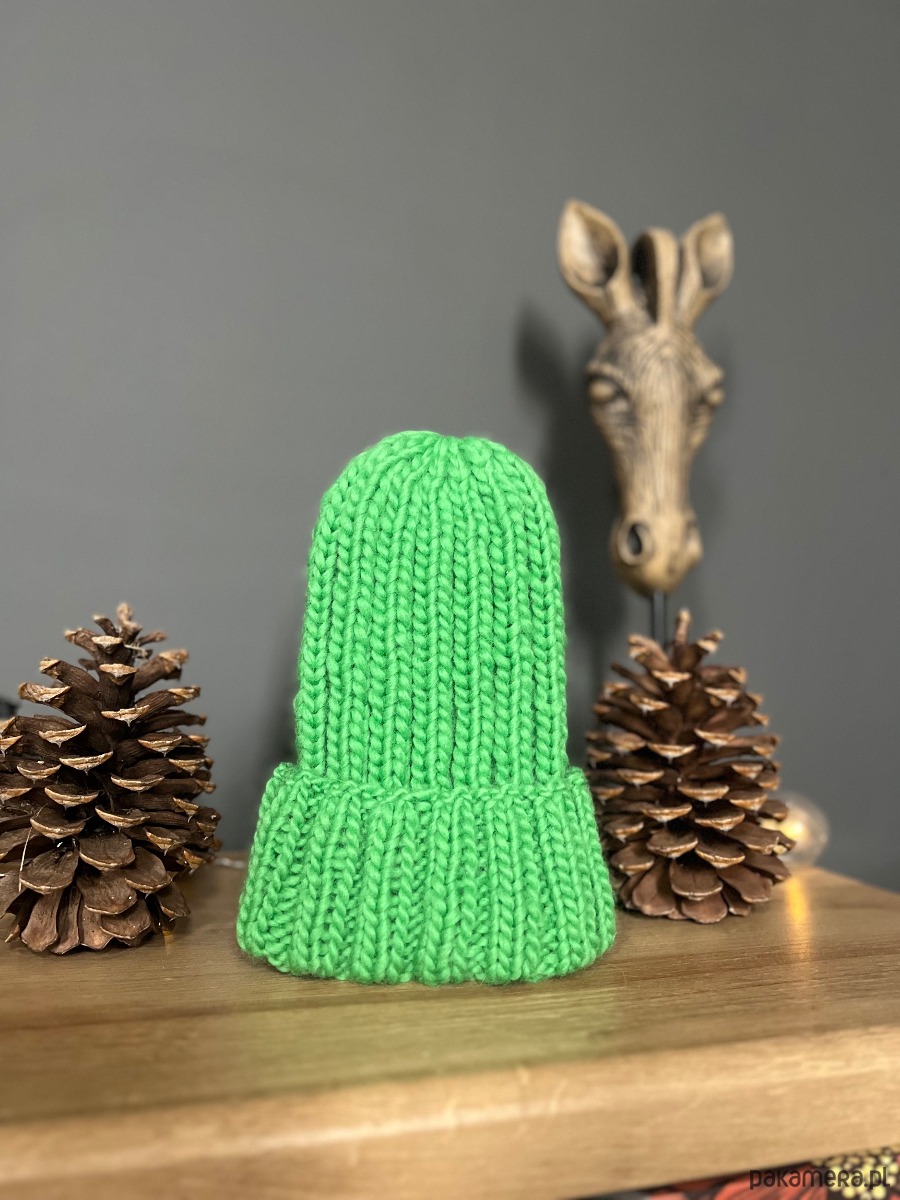 Czapka w kolorze zielonym, wykonana z naturalnej włóczki 100% wełna