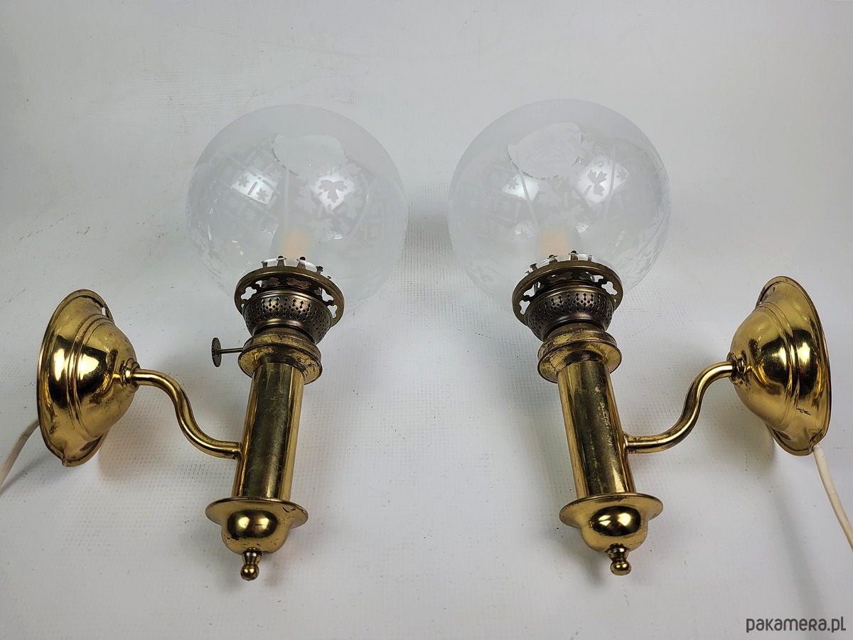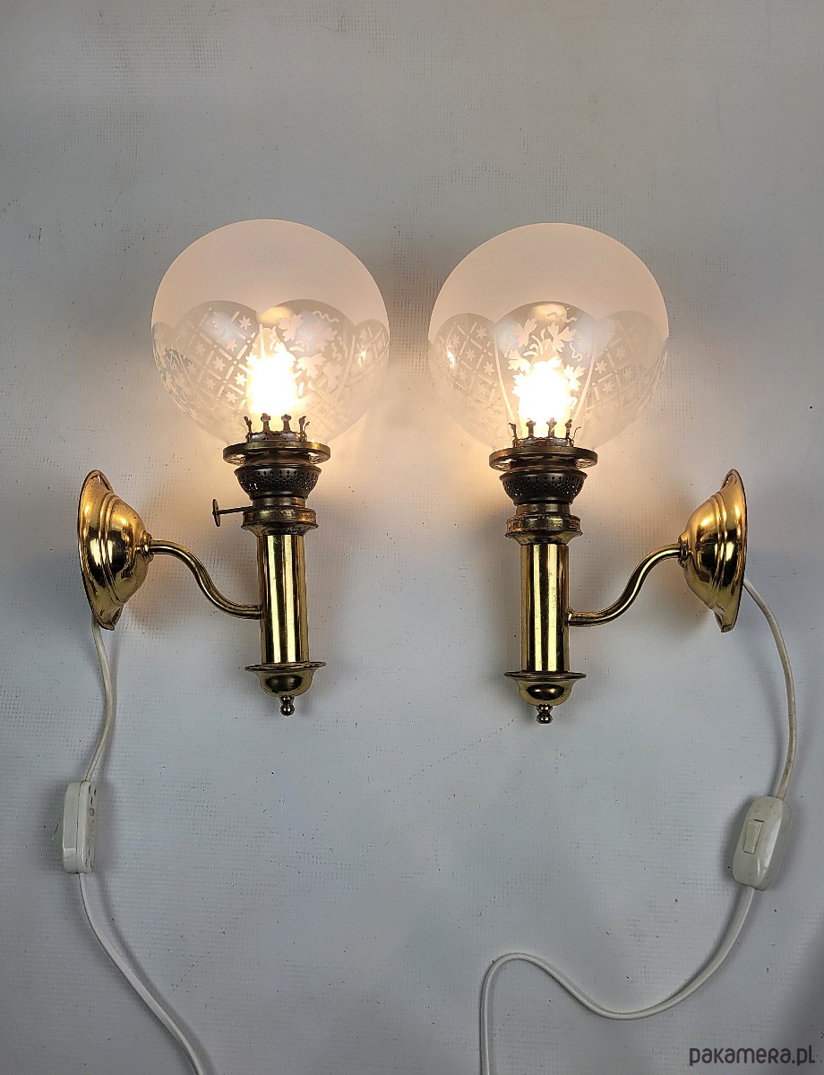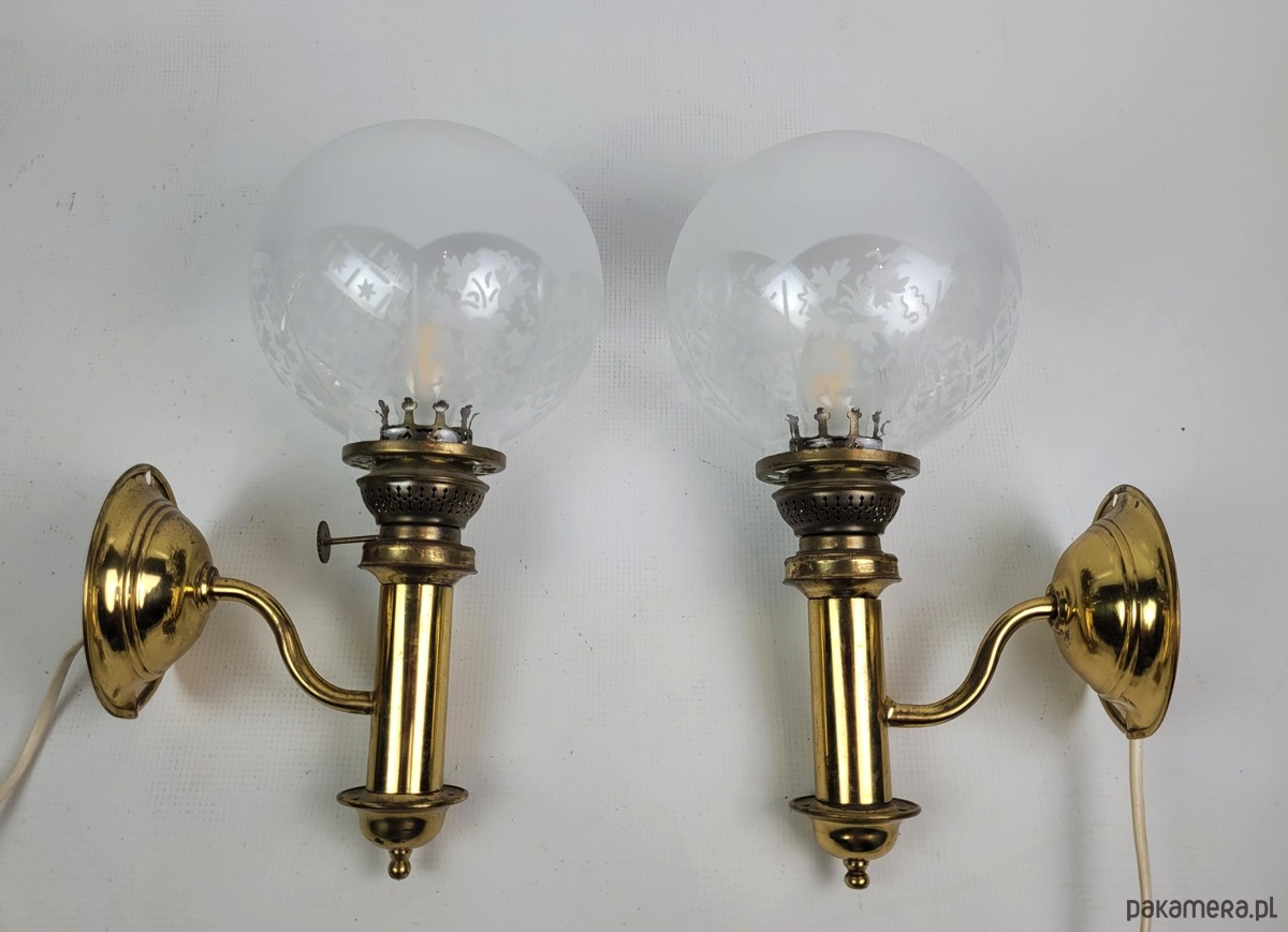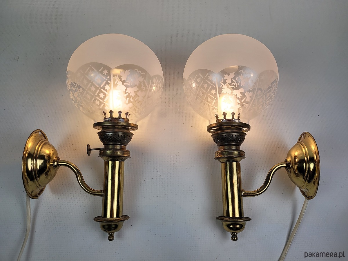 Para kinkietów z mosiężnymi detalami i pięknymi frezowanymi, szklanymi kloszami. Lampy pochodzą z modelu H.H. Metal, typ nr 1050 pochodzących ze Szwecji z lat 50. Para eleganckich kinkietów wykonanych z polerowanego mosiądzu, które łączą w sobie klasyczne wzornictwo z subtelnym zdobnictwem. Każda lampa posiada kulisty klosz z mrożonego szkła, ozdobiony precyzyjnie grawerowanym motywem kwiatowym oraz geometrycznym pasem u dołu. Stabilne, mosiężne ramię o wygiętym kształcie podtrzymuje pionowy korpus zwieńczony dekoracyjną galeryjką, co nadaje całości charakteru retro przypominającego dawne lampy naftowe. Kinkiety emitują ciepłe, rozproszone światło, tworząc przytulną atmosferę w salonie, sypialni lub przedpokoju. Solidna konstrukcja i dbałość o detale sprawiają, że zestaw ten stanowi wyjątkowy element dekoracyjny dla miłośników stylu vintage i antyków. Maksymalna moc żarówek to 40 W. Klosze są nakładane na część mosiężną, są swobodnie osadzone jak w przypadku lamp naftowych. Stan dobry posiadają patynę i ślady użytkowania.