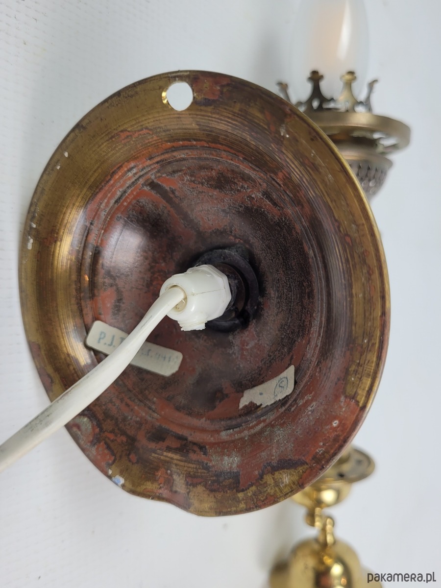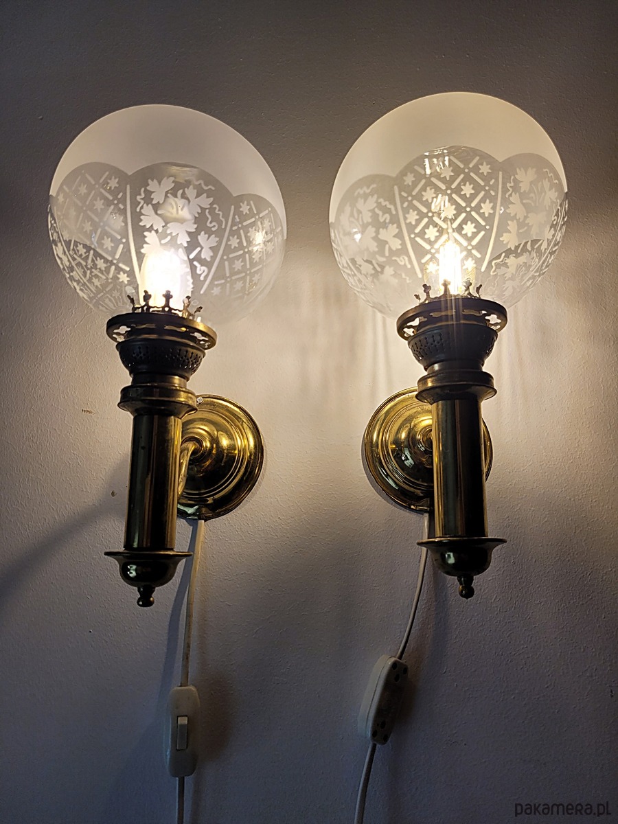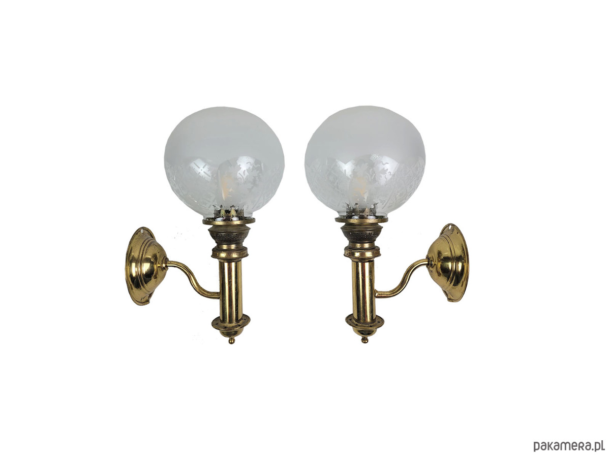 Para kinkietów z mosiężnymi detalami i pięknymi frezowanymi, szklanymi kloszami. Lampy pochodzą z modelu H.H. Metal, typ nr 1050 pochodzących ze Szwecji z lat 50. Para eleganckich kinkietów wykonanych z polerowanego mosiądzu, które łączą w sobie klasyczne wzornictwo z subtelnym zdobnictwem. Każda lampa posiada kulisty klosz z mrożonego szkła, ozdobiony precyzyjnie grawerowanym motywem kwiatowym oraz geometrycznym pasem u dołu. Stabilne, mosiężne ramię o wygiętym kształcie podtrzymuje pionowy korpus zwieńczony dekoracyjną galeryjką, co nadaje całości charakteru retro przypominającego dawne lampy naftowe. Kinkiety emitują ciepłe, rozproszone światło, tworząc przytulną atmosferę w salonie, sypialni lub przedpokoju. Solidna konstrukcja i dbałość o detale sprawiają, że zestaw ten stanowi wyjątkowy element dekoracyjny dla miłośników stylu vintage i antyków. Maksymalna moc żarówek to 40 W. Klosze są nakładane na część mosiężną, są swobodnie osadzone jak w przypadku lamp naftowych. Stan dobry posiadają patynę i ślady użytkowania.