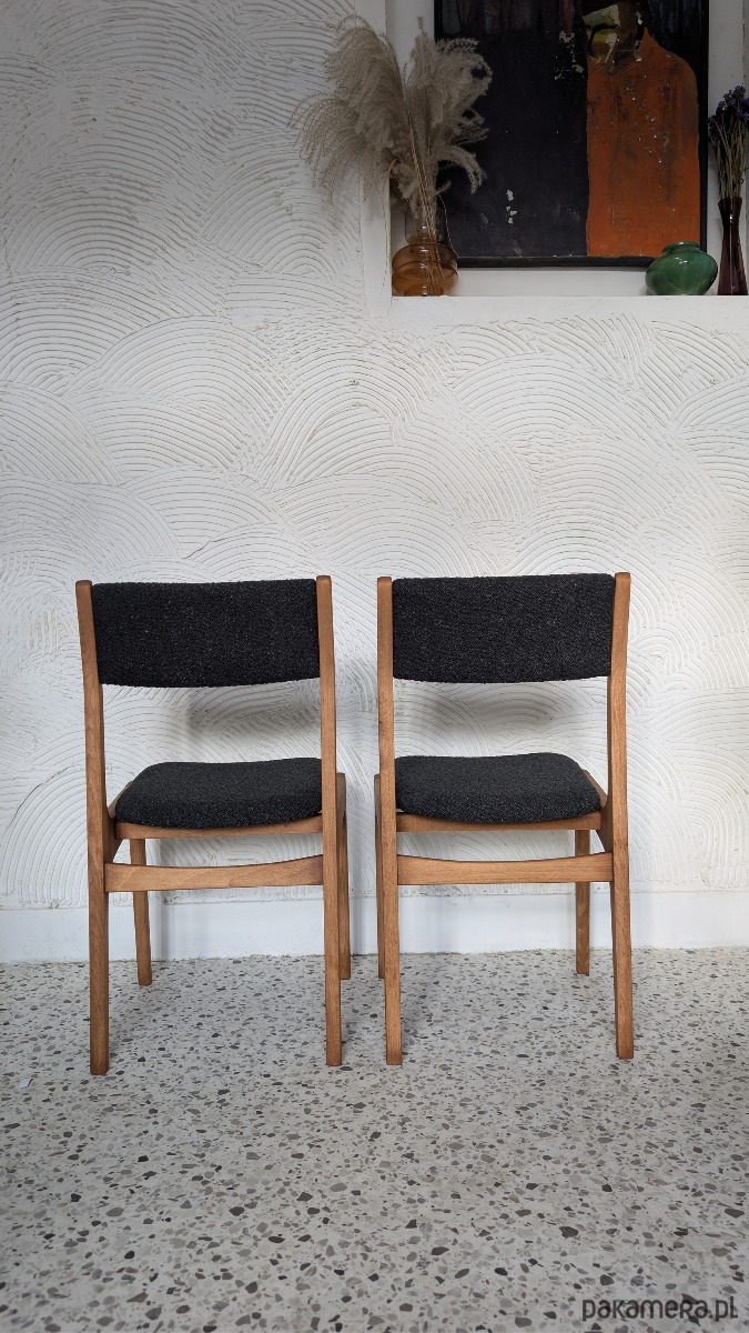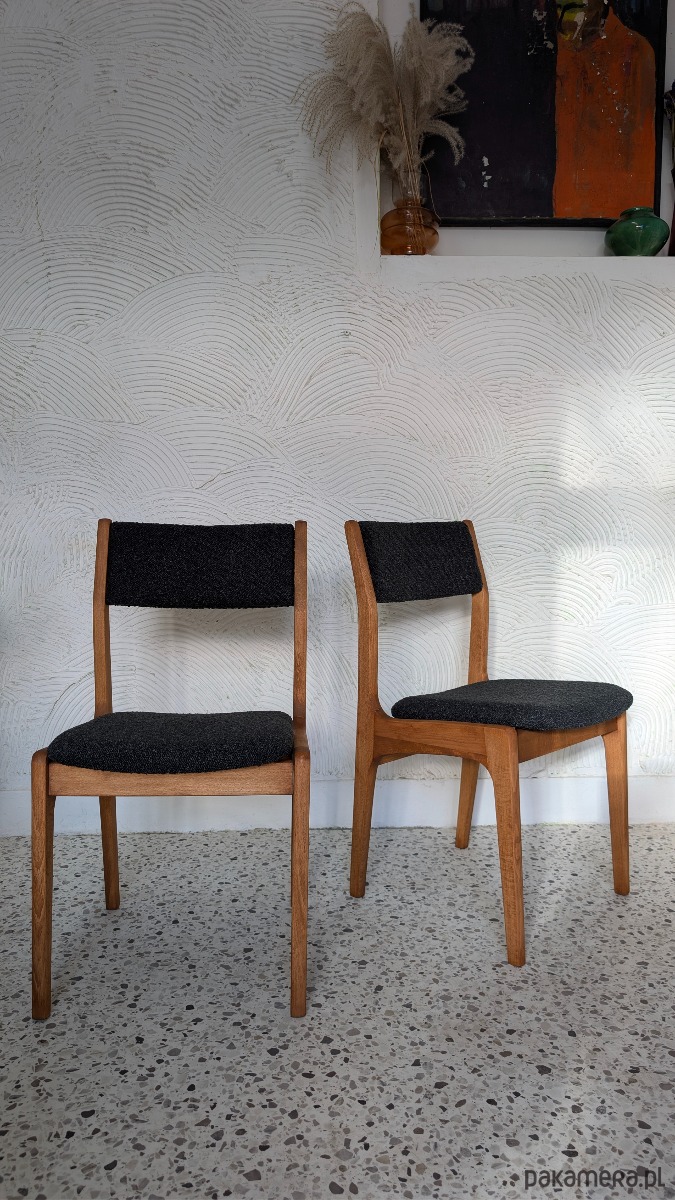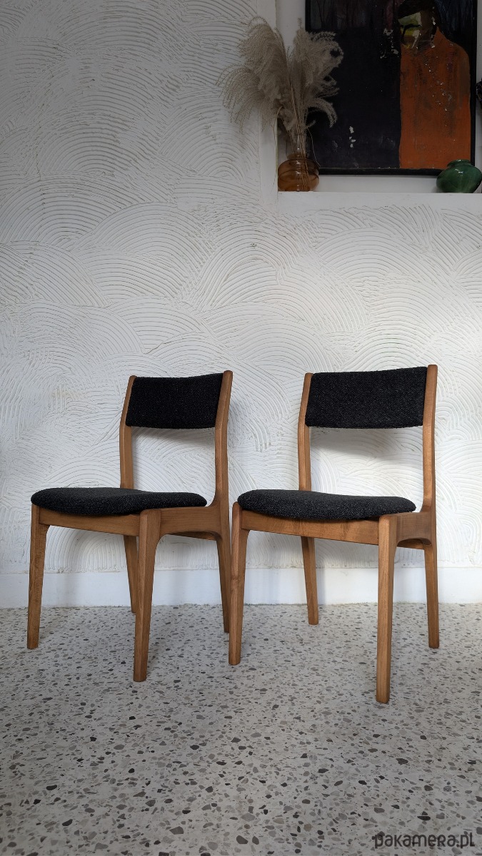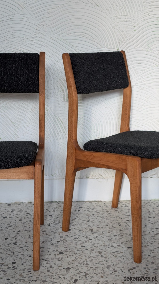 Zostały poddane gruntownej renowacji stolarsko - tapicerskiej. Drewno zabezpieczono woskiem olejnym, elementy tapicerki zostały wykończone wysokiej jakości tkaniną boucle w głębokim czarnym odcieniu.