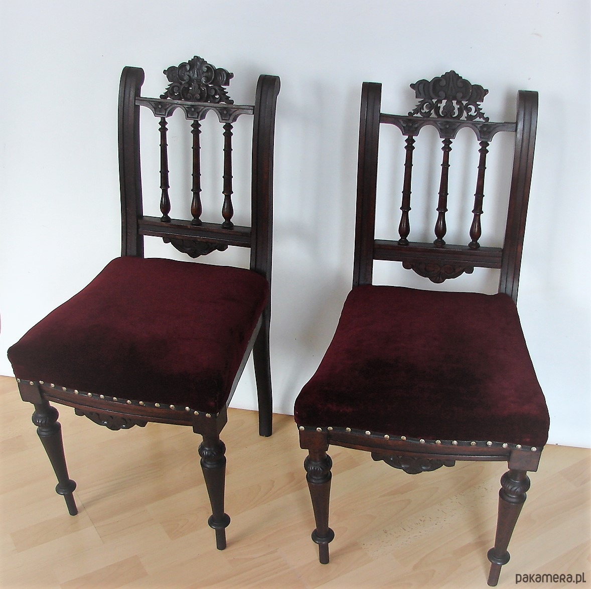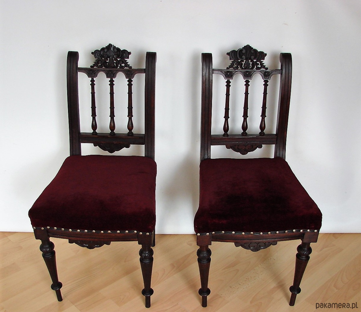 Autentyczna para krzeseł z XIX wieku – wyjątkowy przykład meblarstwa z epoki, łączący solidne rzemiosło z ponadczasową estetyką. Konstrukcja wykonana z drewna, z siedziskiem i oparciem obitym miękką tkaniną welurową, która nadaje całości szlachetnego, dekoracyjnego charakteru.