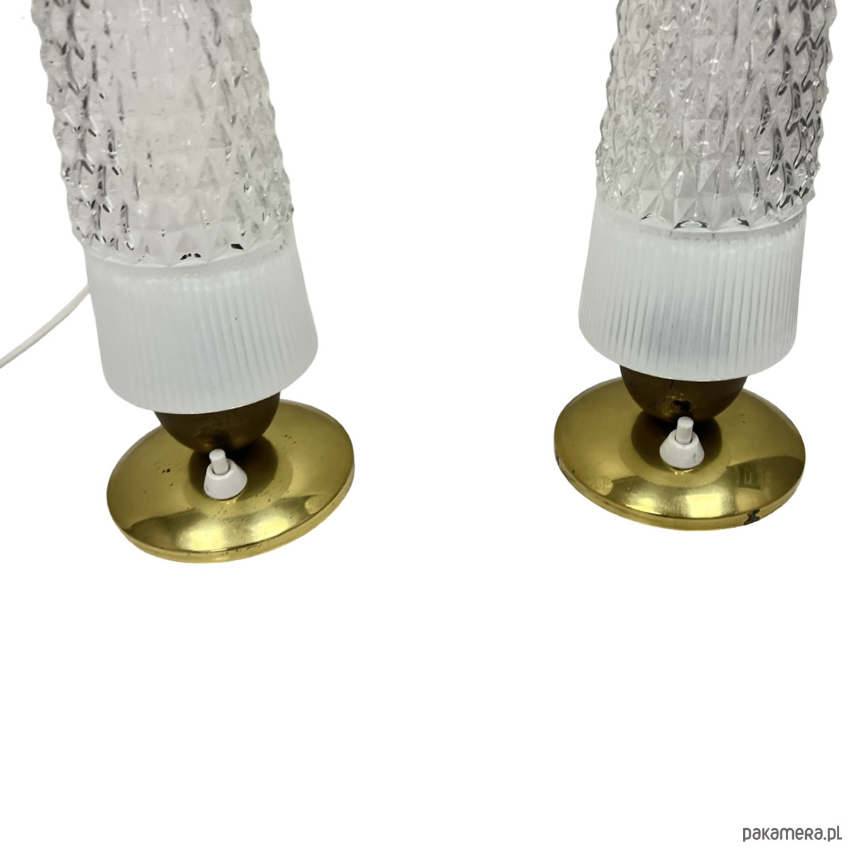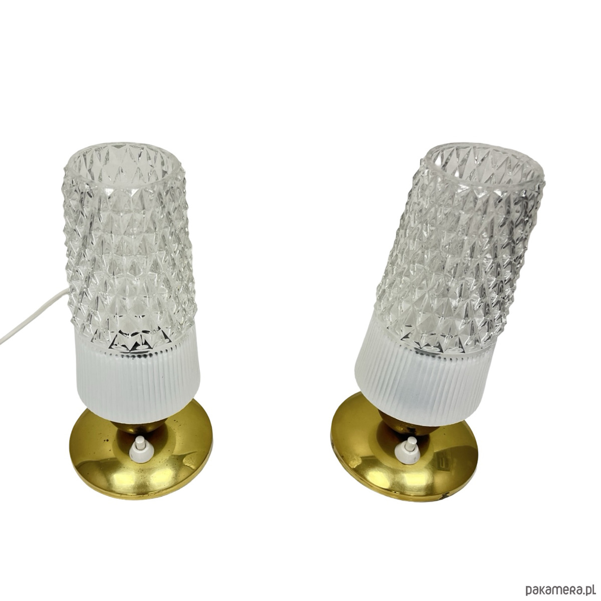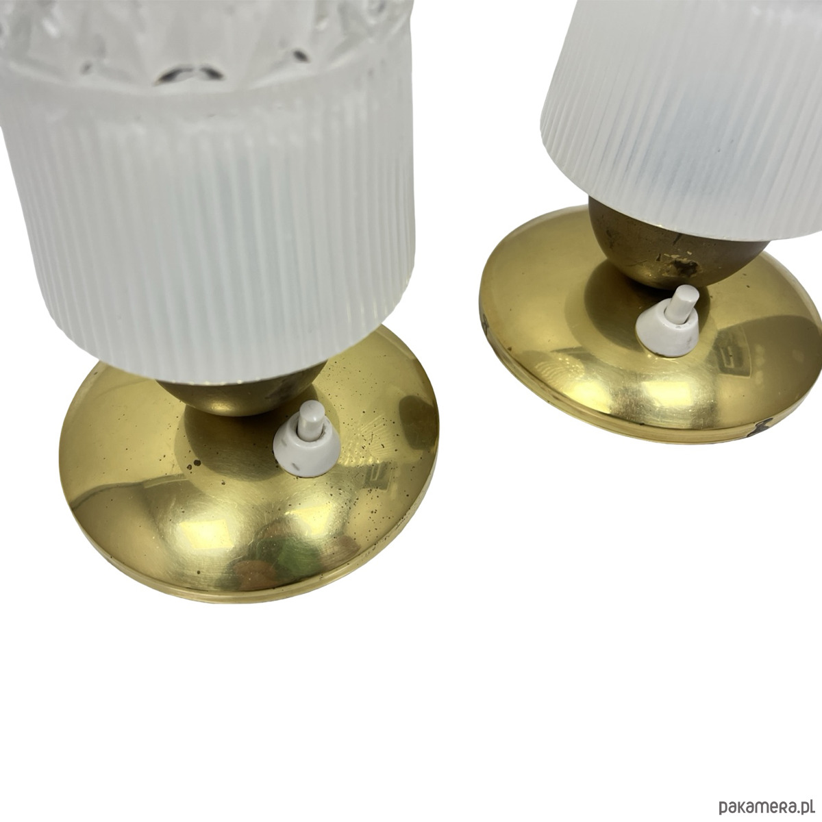 lampki są w pełni sprawne technicznie. stan wizualny bardzo dobry – szklane klosze bez uszkodzeń. na metalowych podstawach widoczne ślady czasu w postaci patyny, co podkreśla ich autentyczne pochodzenie vintage.