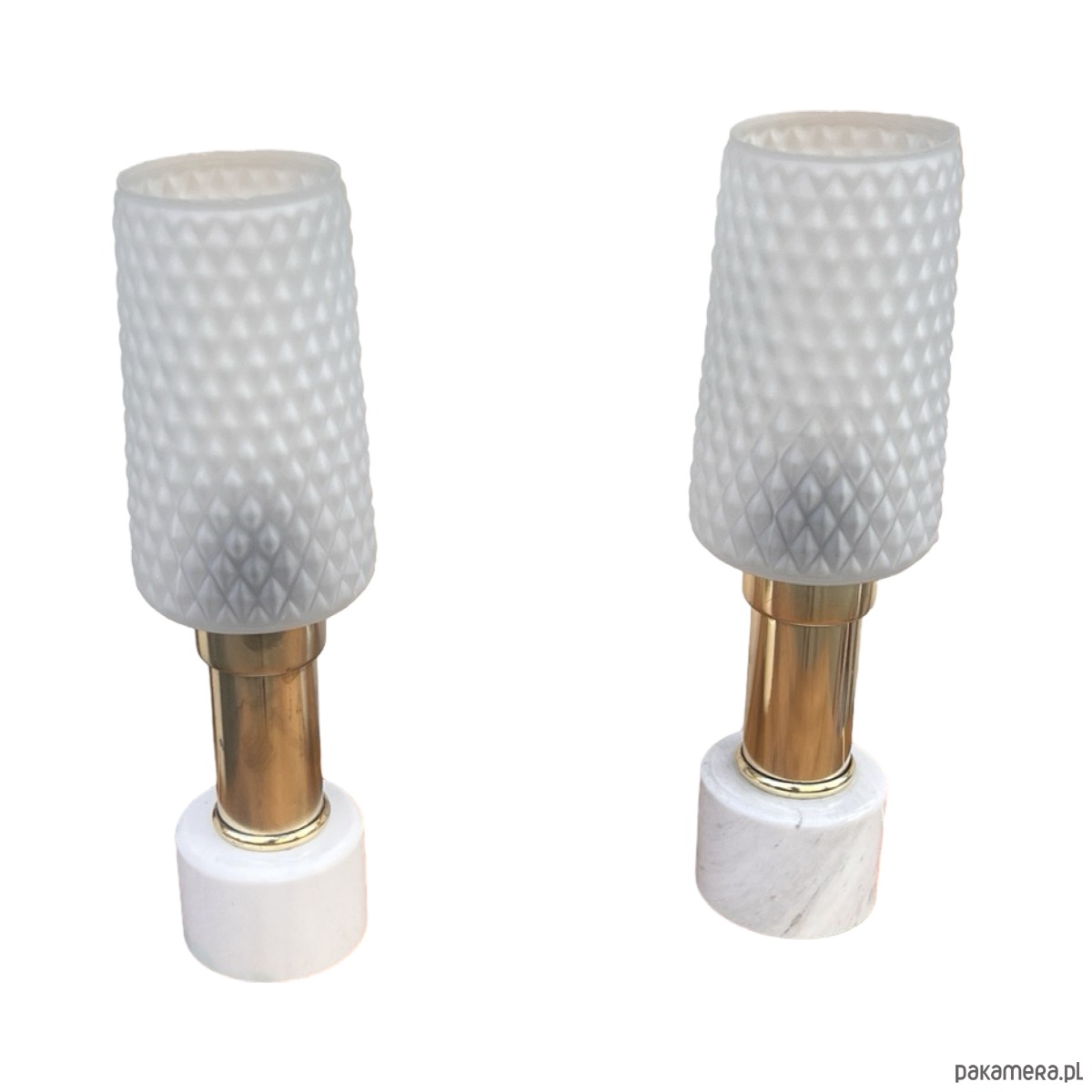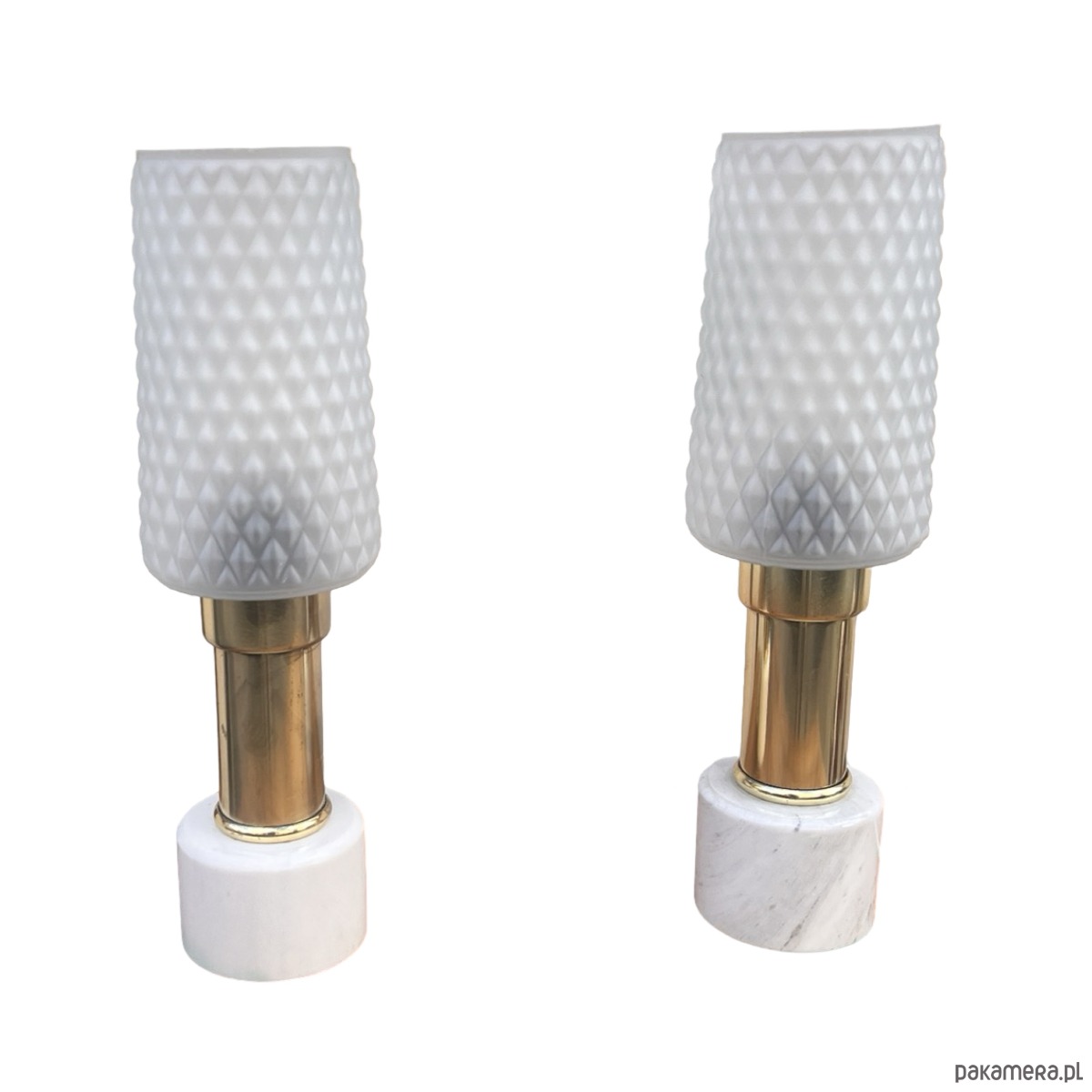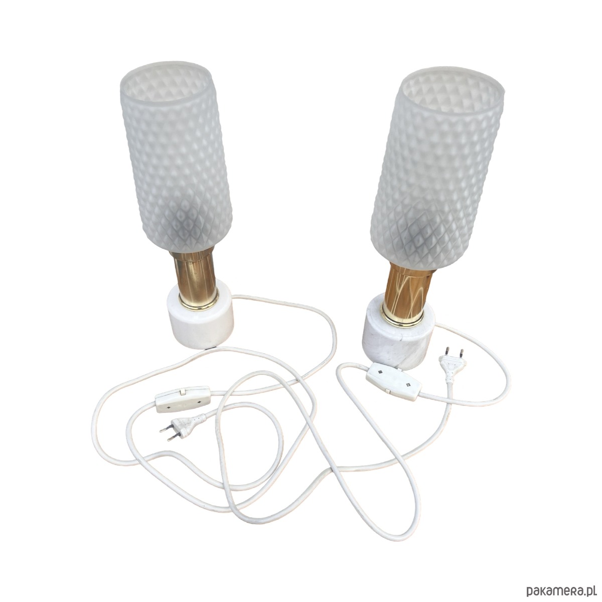 Para lampek nocnych typ 1182 z lat 70. produkcji niemieckiej wyprodukowany przez VEB Narva Leuchtenbau Lengefeld. Lampy o marmurowych podstawach i ciekawych kloszach szklanych w stylu modernistycznym, połączonych z podstawą mosiężnym ramieniem. Lampki mają włącznik w kablu, działają na pojedyncze żarówki E27 do 60W. Przedmiot w pełni sprawny technicznie, nosi normalne ślady użytkowania, lampy bez uszkodzeń. Przedmiot sprzedawany jako kolekcjonerski, pamiątka z XX wieku. Fajne przedmioty w stylu Hollywood Regency.