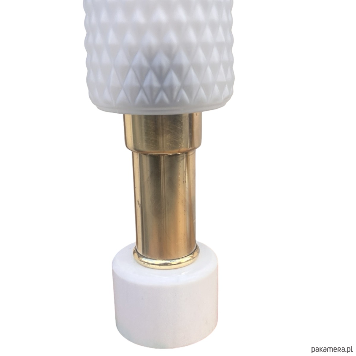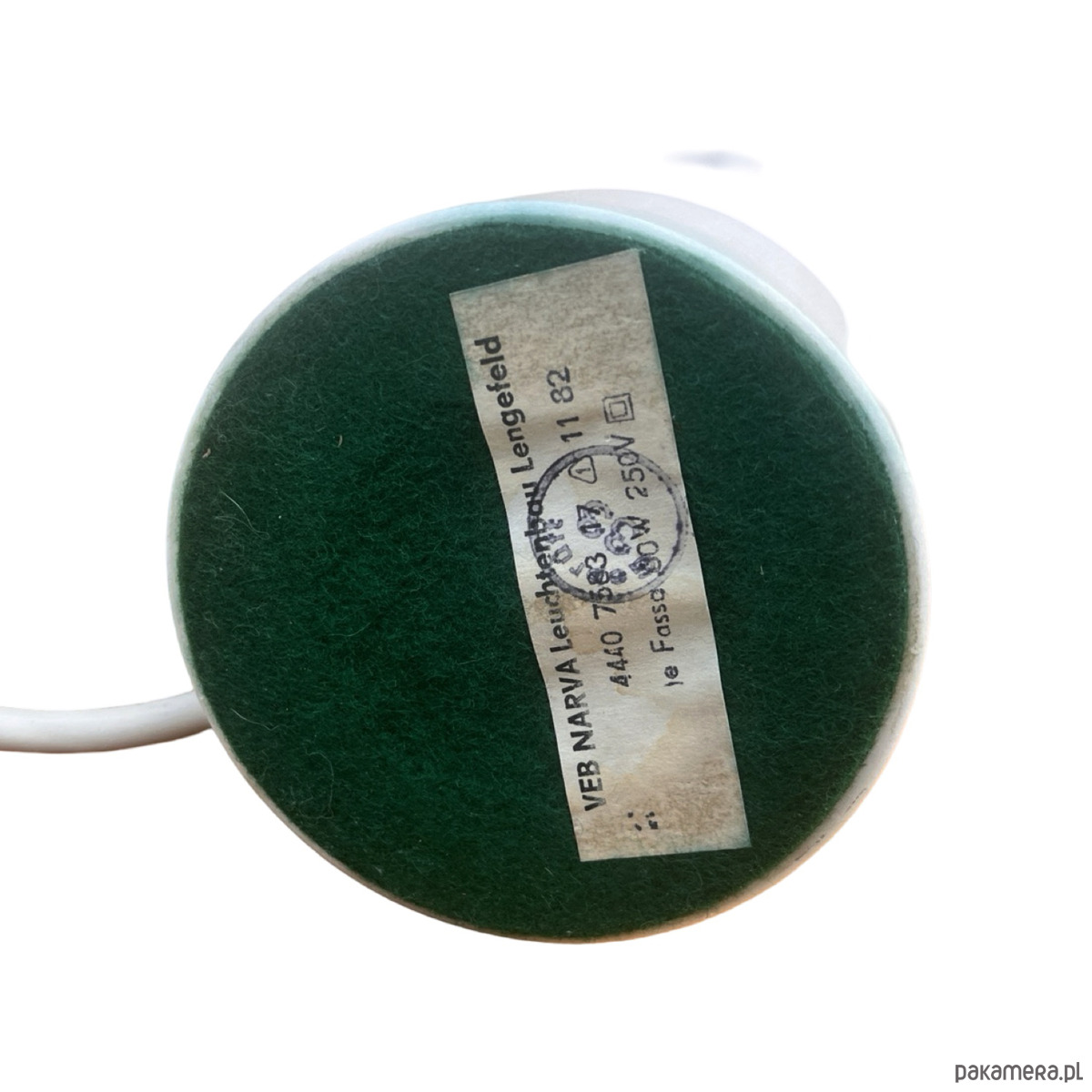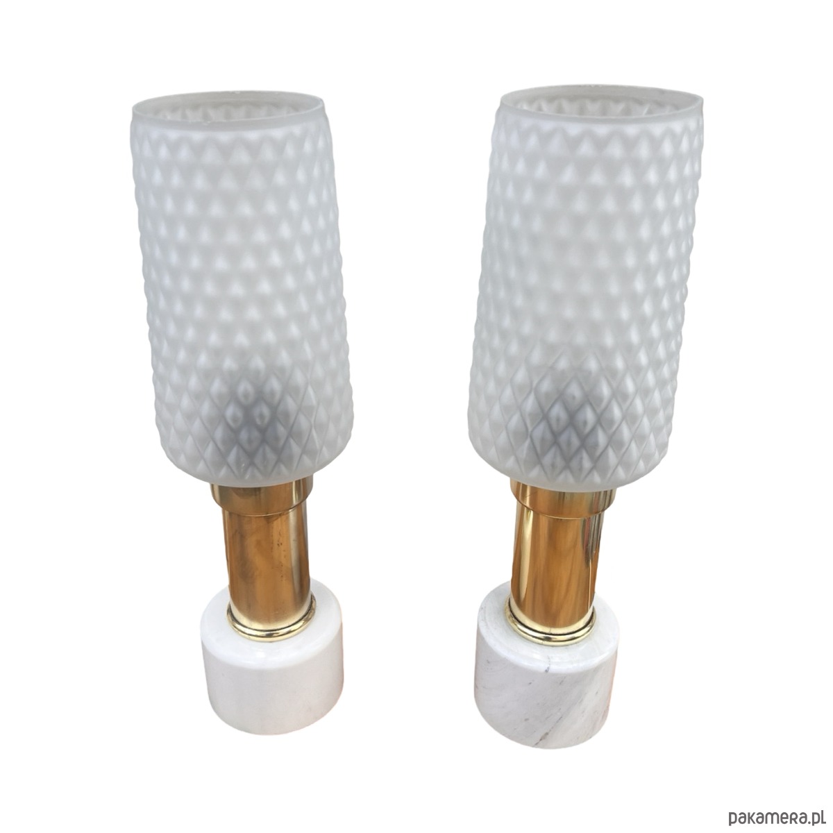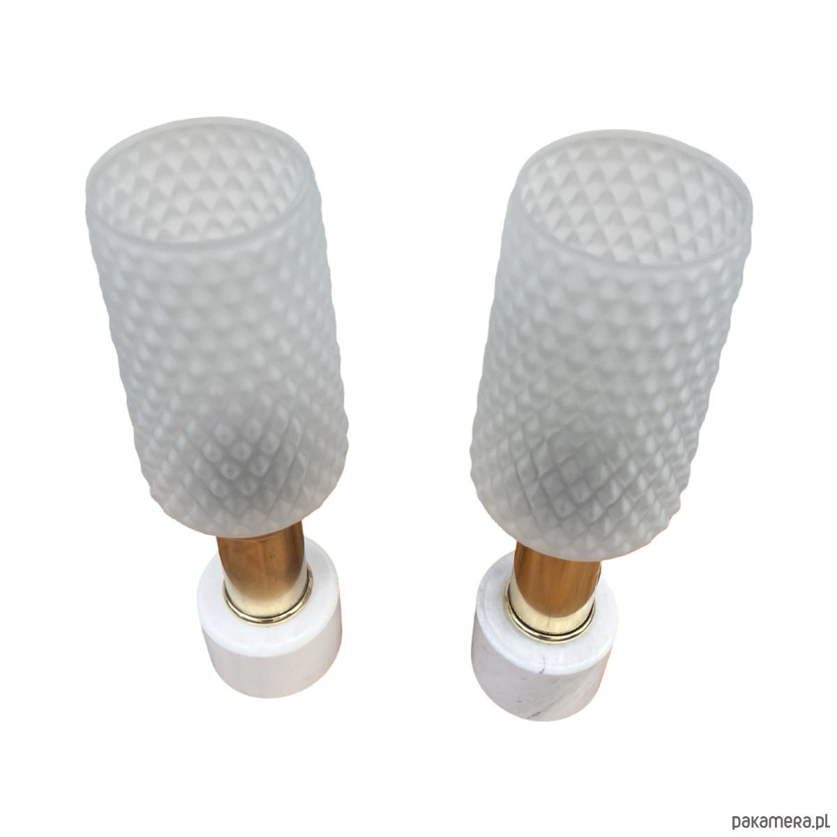 Para lampek nocnych typ 1182 z lat 70. produkcji niemieckiej wyprodukowany przez VEB Narva Leuchtenbau Lengefeld. Lampy o marmurowych podstawach i ciekawych kloszach szklanych w stylu modernistycznym, połączonych z podstawą mosiężnym ramieniem. Lampki mają włącznik w kablu, działają na pojedyncze żarówki E27 do 60W. Przedmiot w pełni sprawny technicznie, nosi normalne ślady użytkowania, lampy bez uszkodzeń. Przedmiot sprzedawany jako kolekcjonerski, pamiątka z XX wieku. Fajne przedmioty w stylu Hollywood Regency.