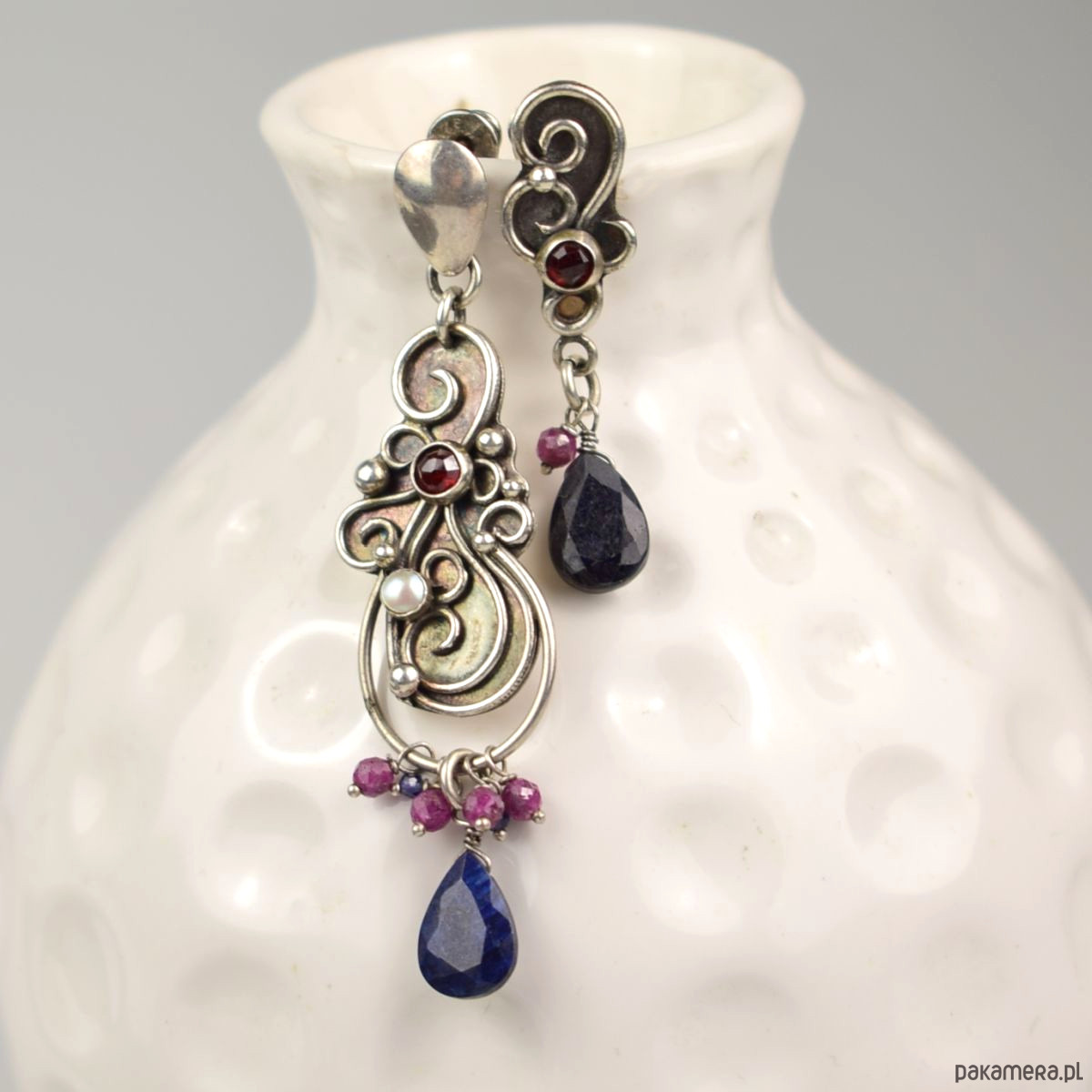 Para nie do pary - kolczyki srebrne z szafirem, rubinem, granatem i perłą