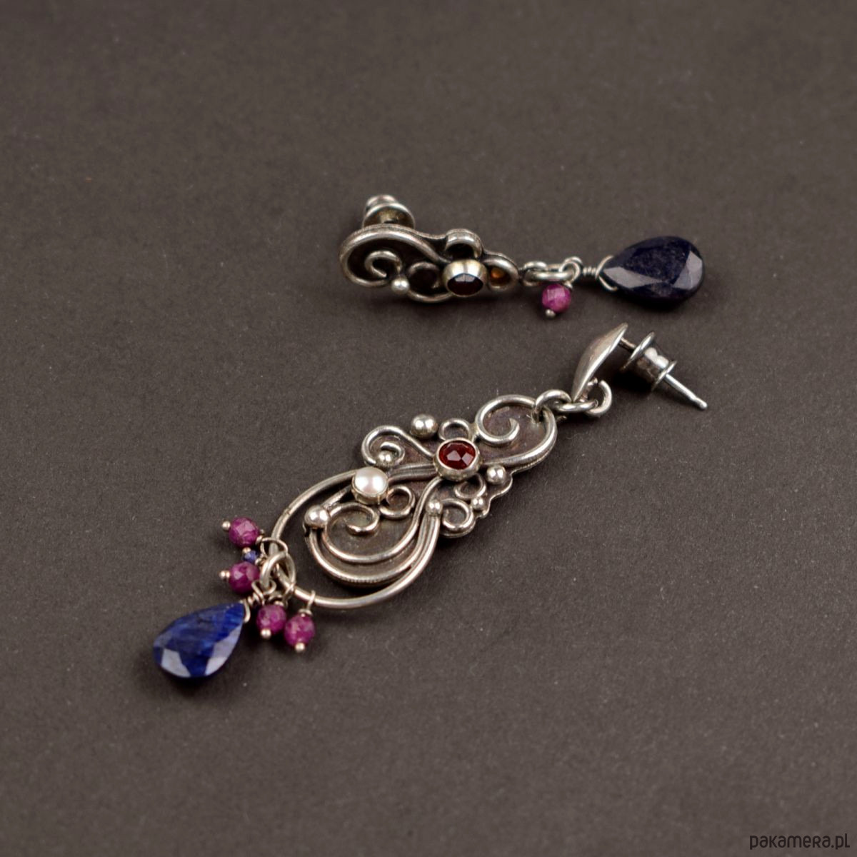 Kolczyki zostały zaprojektowane i wykonane od podstaw w pracowni Sunflower. Jedyny egzemplarz. Biżuteria została przyciemniona (oksydowanie) a następnie wypolerowana. Długość Kolczyków 6 cm i 3,7 cm. Użyte kamienie: szafir, rubin, granat i perła. Biżuteria zostanie ozdobnie zapakowana.