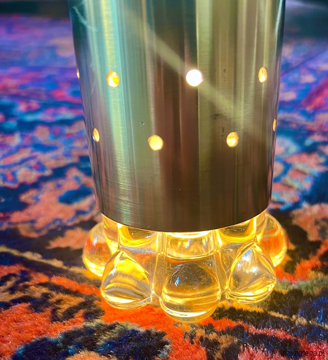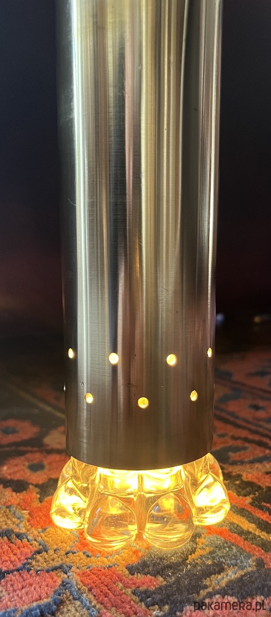 Po zapaleniu dają bardzo klimatyczne, ciepłe światło — szkło rozprasza je w miękki, „bąbelkowy” sposób, tworząc efekt typowy dla designu lat 60/70.