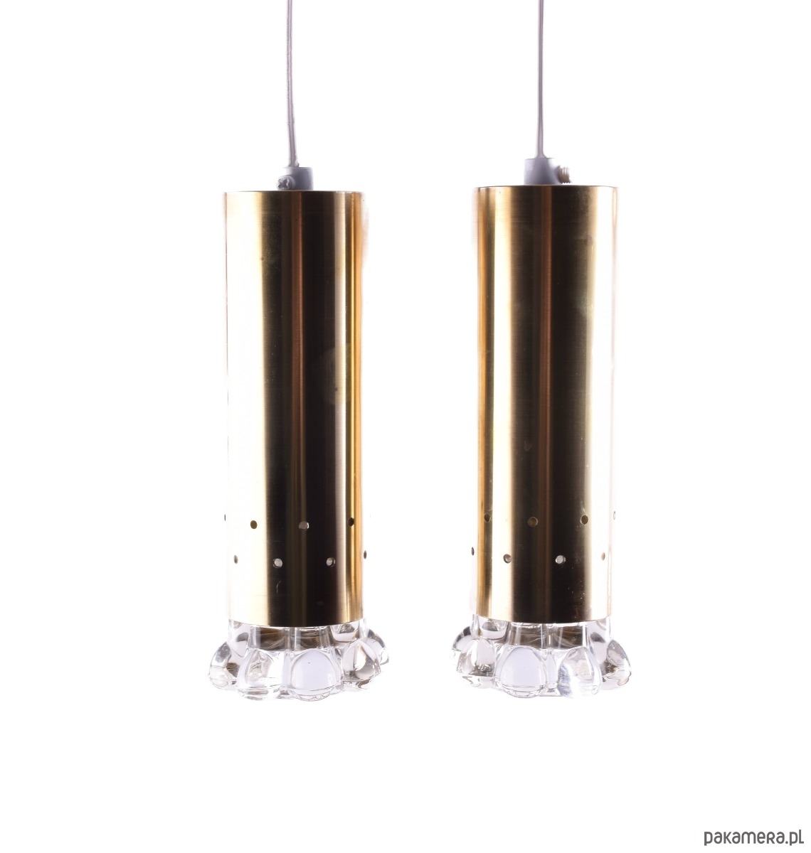 Stylowa para lamp wiszących w klimacie skandynawskiego modernizmu (mid-century). Korpus wykonany z satynowanego mosiądzu szczotkowanego z perforacją, zakończony dekoracyjną podstawą z grubego, formowanego szkła.