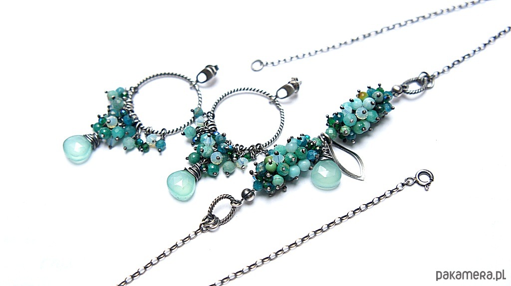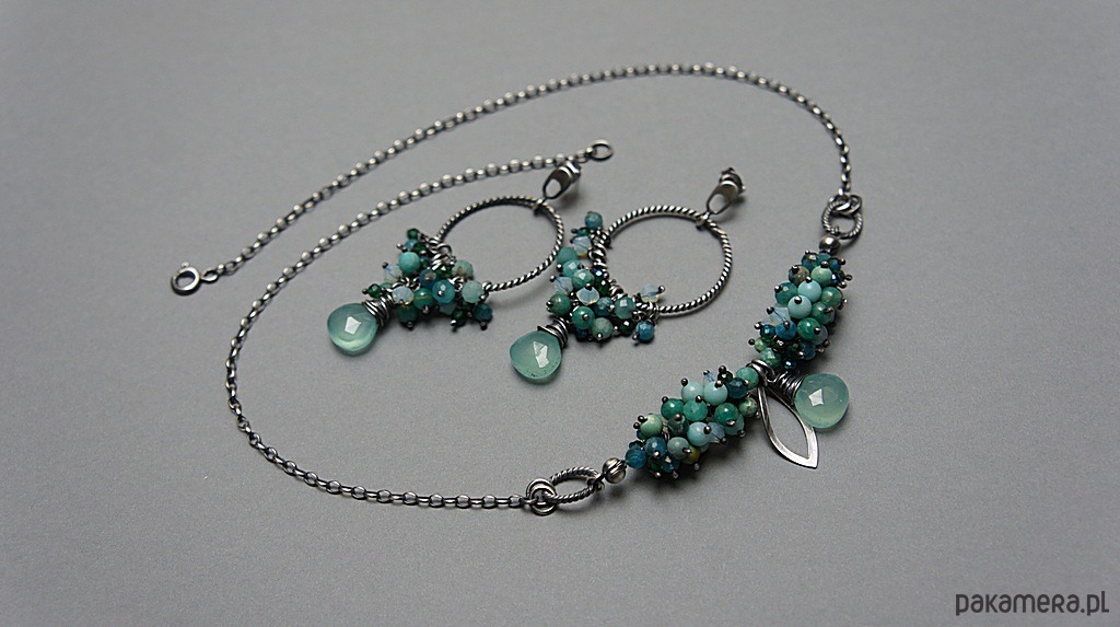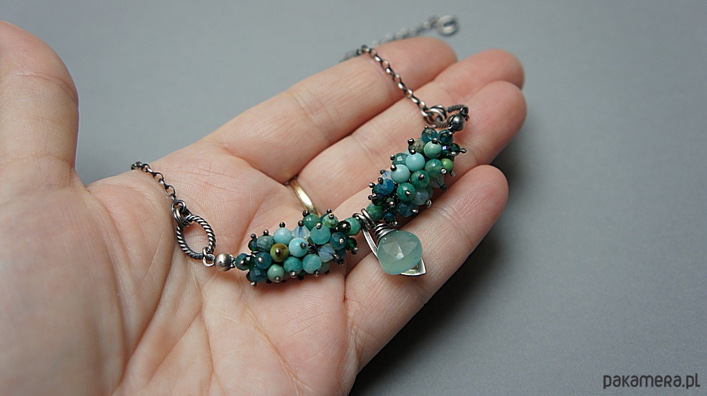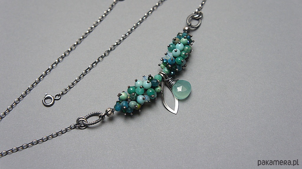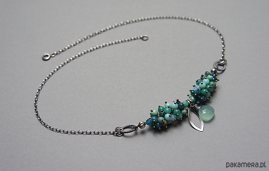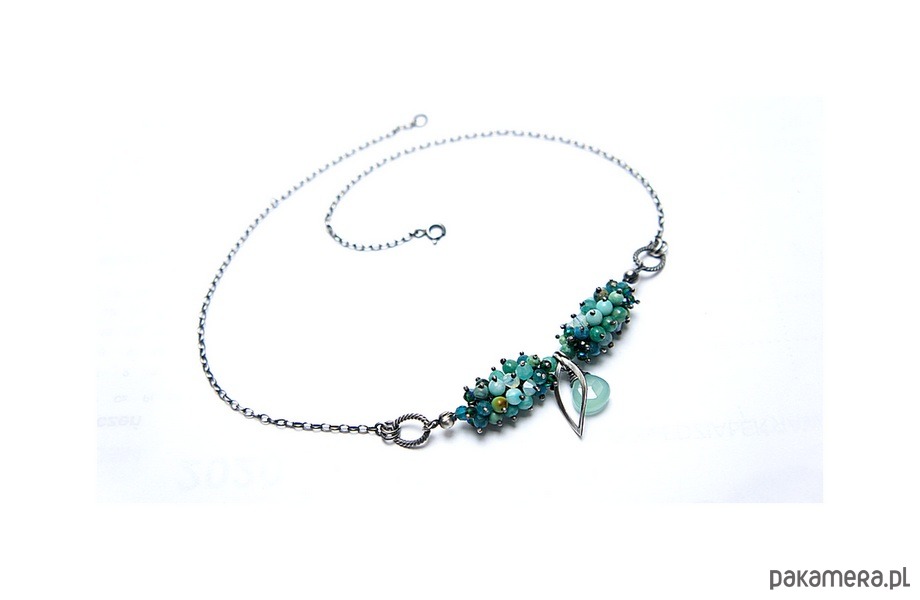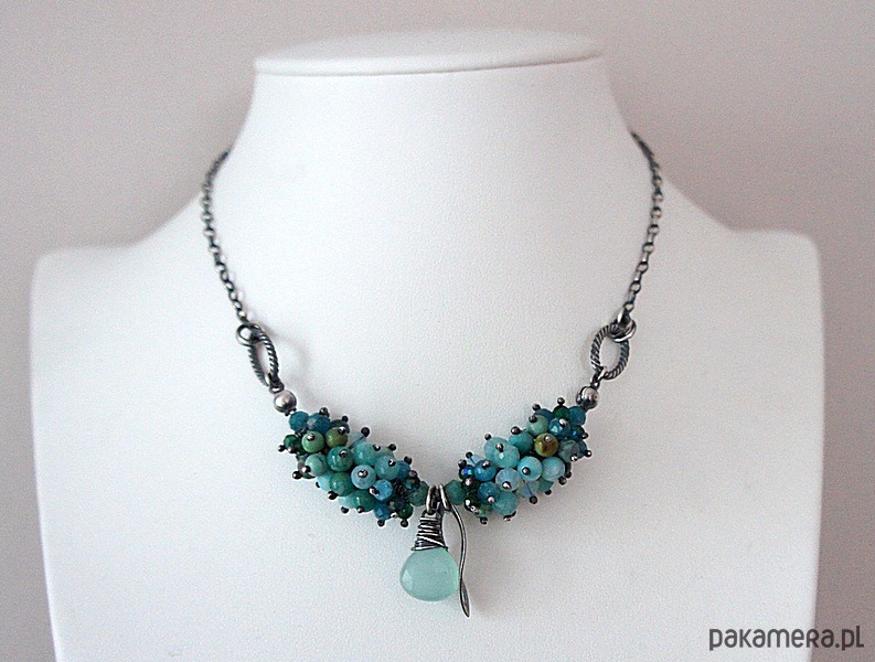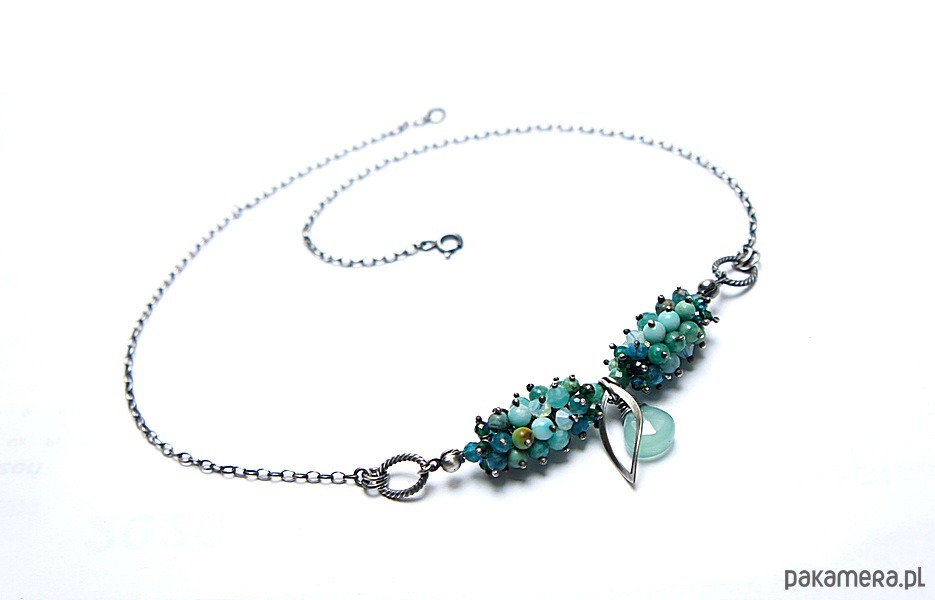 Naszyjnik wykonany ze srebra [pr. 925] w połączeniu z cebulką chalcedonu w błękitnym kolorze , oplecionej drutem [pr. 999 - 10mm] oraz kuleczkami naturalnych turkusów , amazonitów , apatytów [4mm] ,kryształków Swarovski [4mm] ,szmaragdów [3mm-klarowane ]. Całość oksydowana i przetarta. Całkowita długość naszyjnika 46cm. Biżuteria ozdobnie zapakowana.