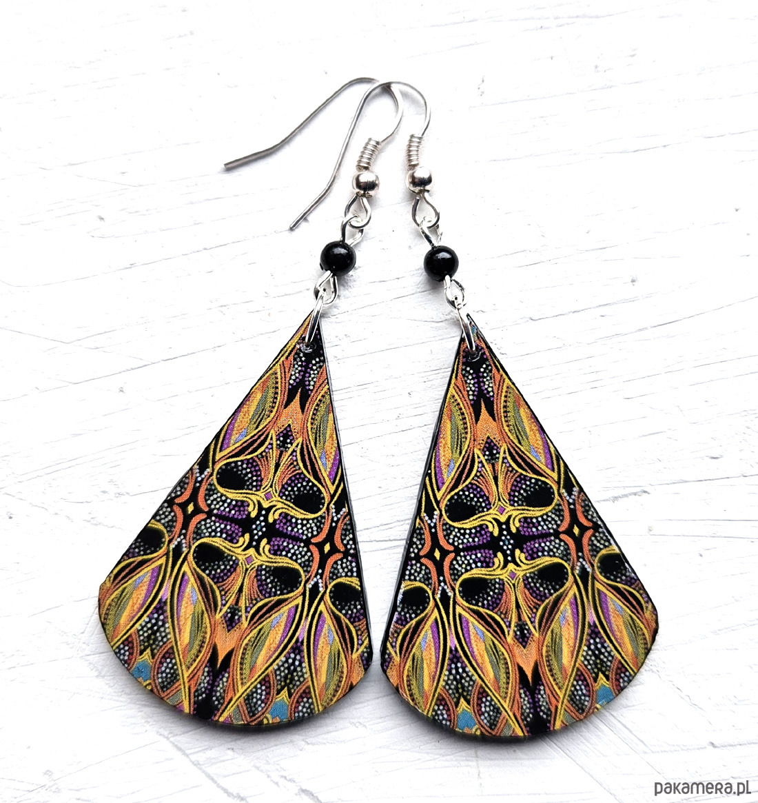 kolczyki drewniane, ozdobione metodą decoupage, dwustronne, starannie wykończone farbami akrylowymi i zabezpieczone wielokrotnie lakierem, bigle posrebrzane, długość kolczyków bez bigli: 5,5 cm, szerokość: 3 cm, bardzo lekkie