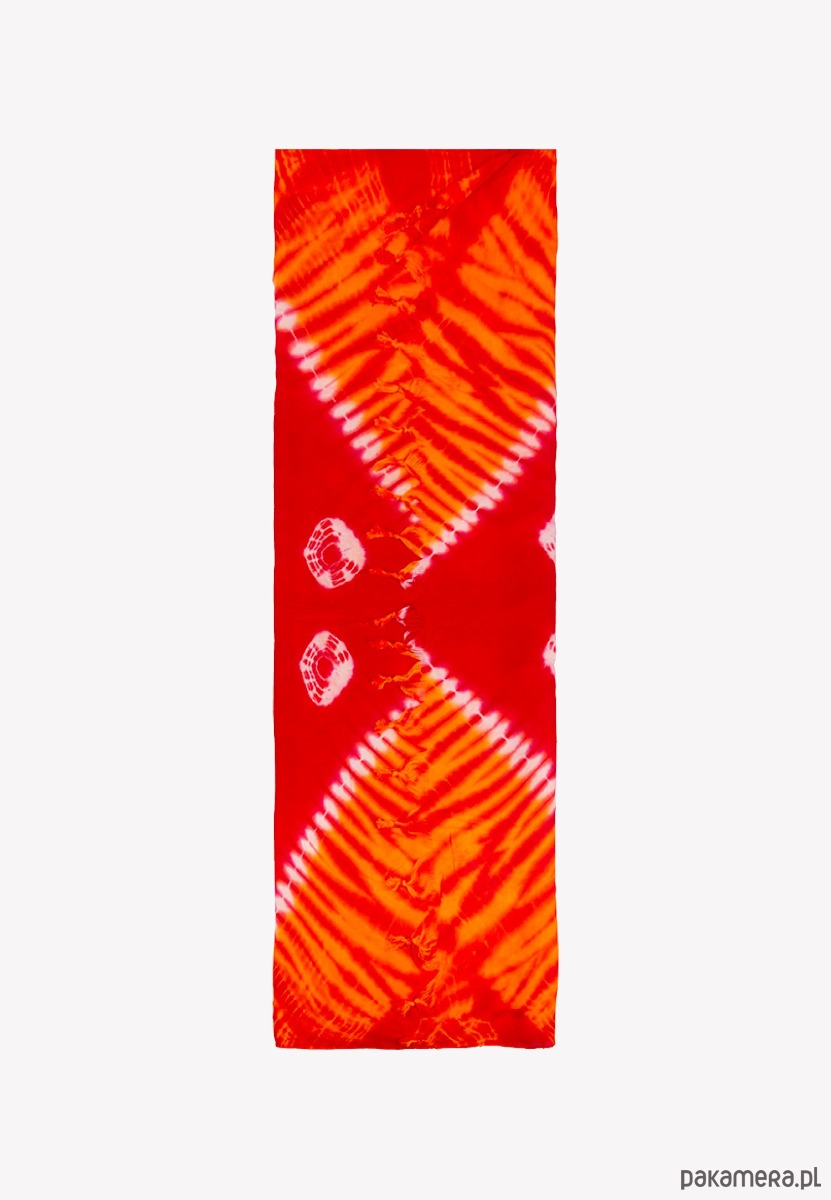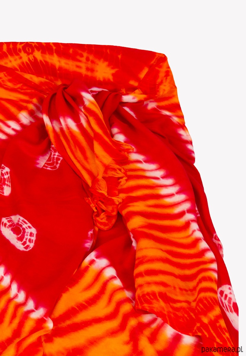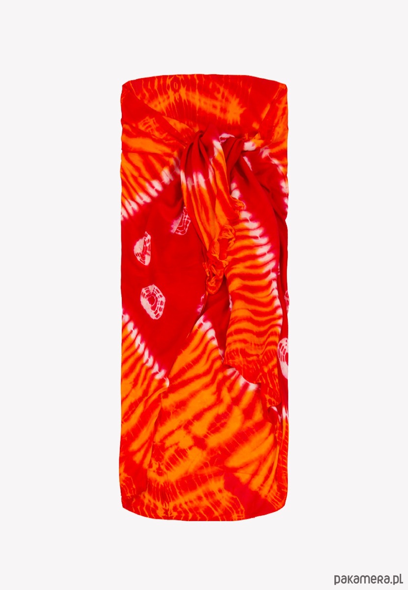 * Kolorystyka tie-dye – intensywne odcienie czerwieni, pomarańczu i bieli przyciągają wzrok i podkreślają opaleniznę.