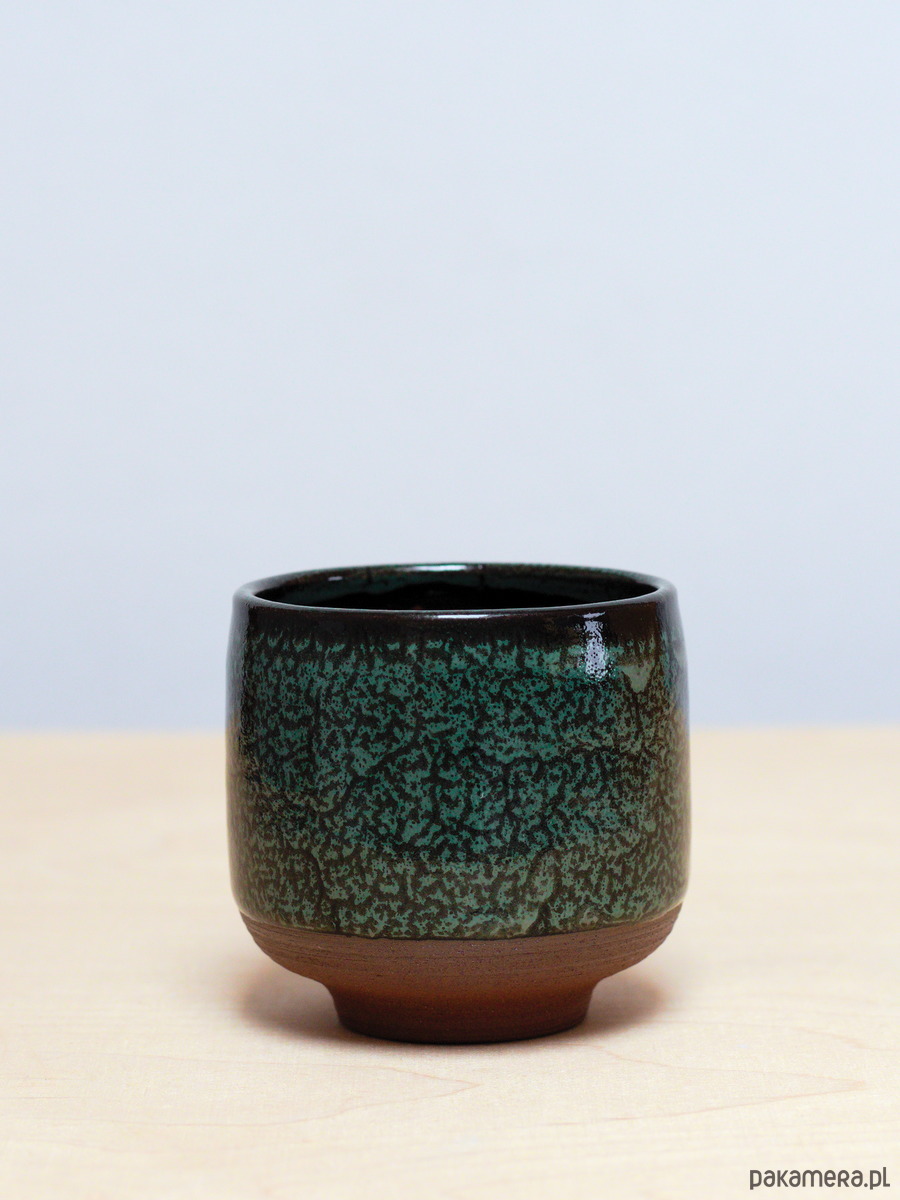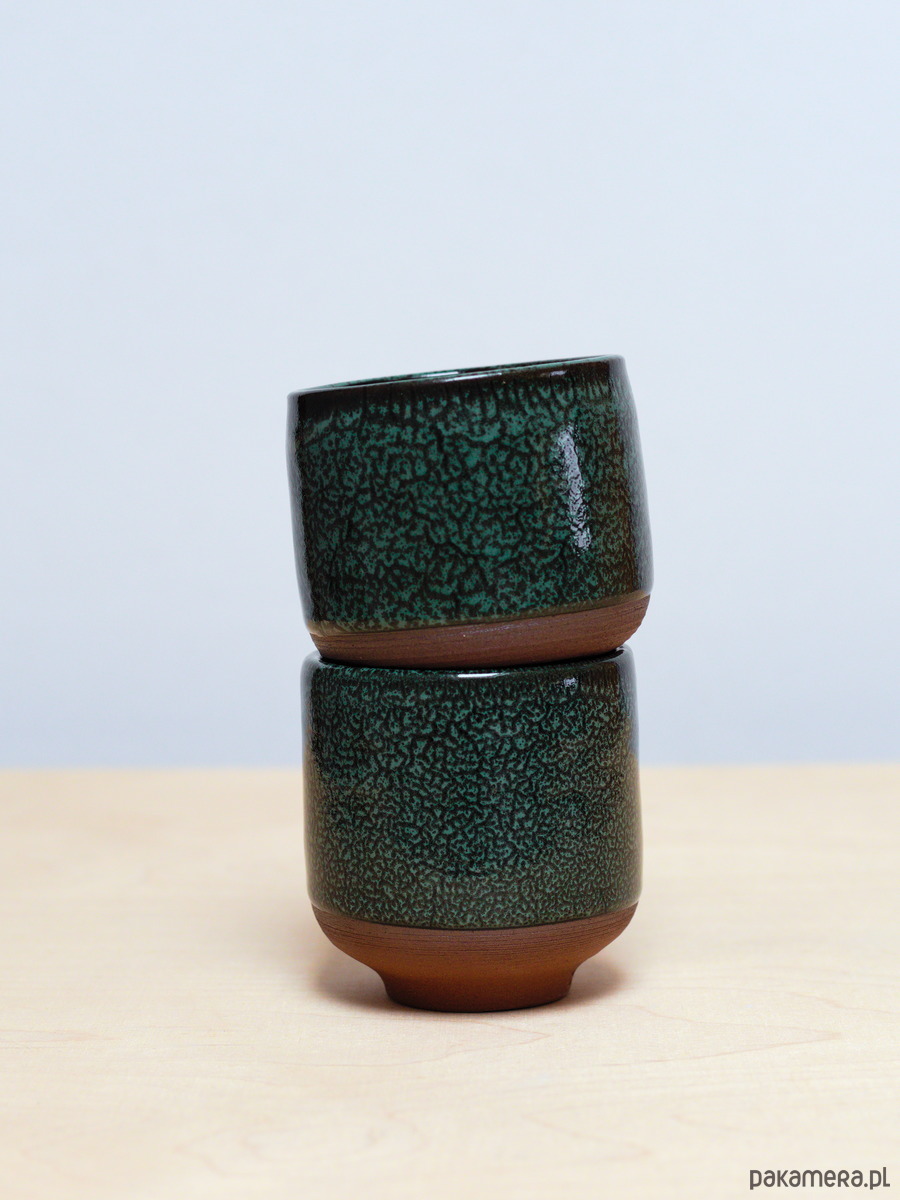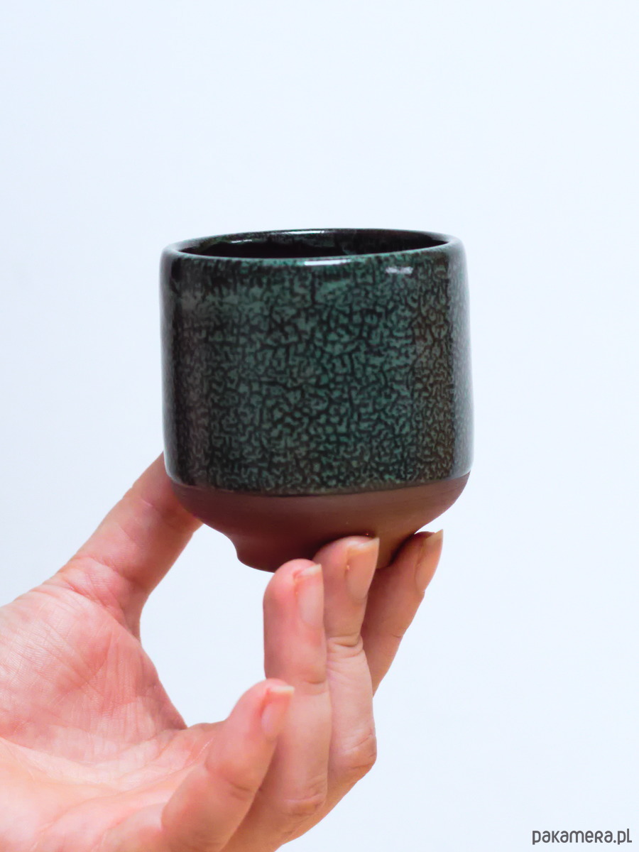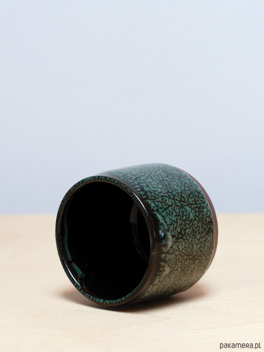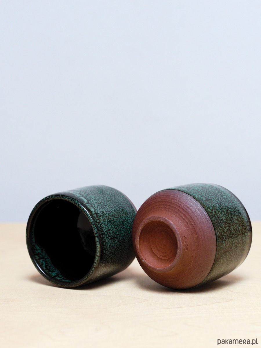 Czarki są szkliwiona na kolor Iglasty Las - ciemna chłodniejsza zieleń z czarnymi i jaśniejszymi przebarwieniami. Powierzchnia szkliwa ma błyszczące wykończenie. Odsłonięta glina jest ciemno ruda.