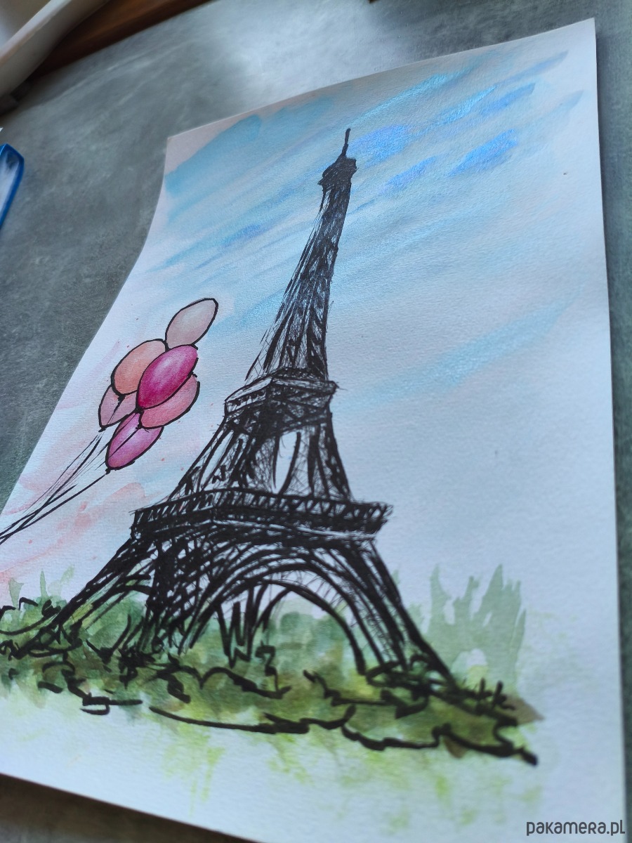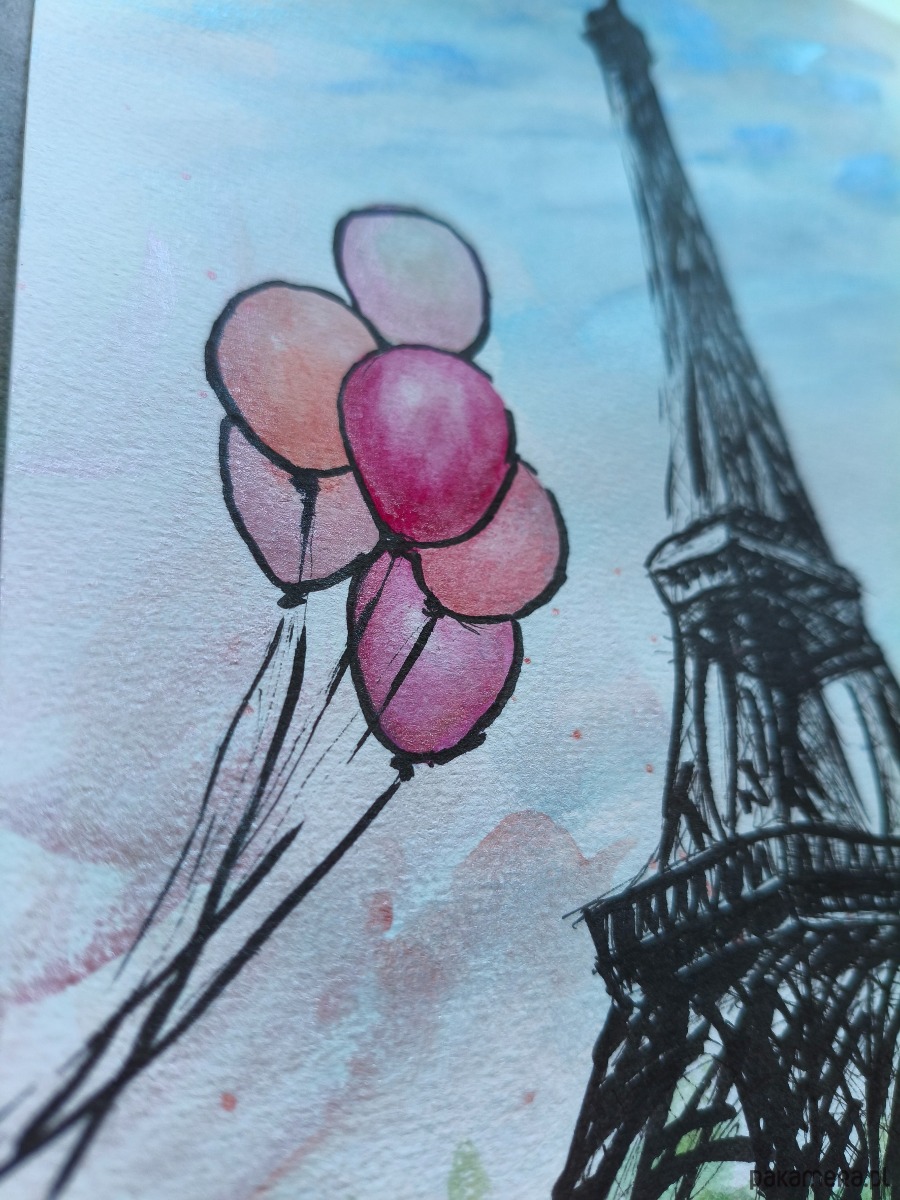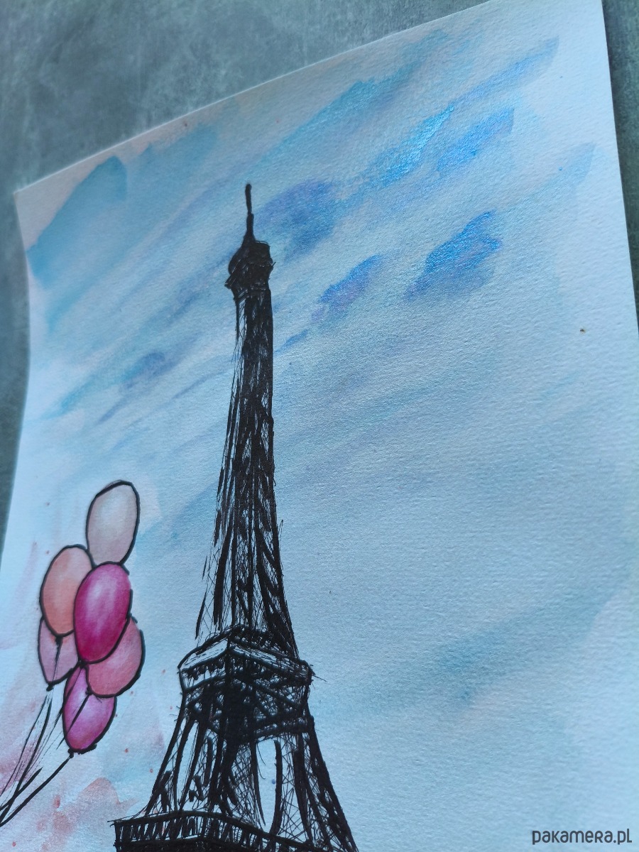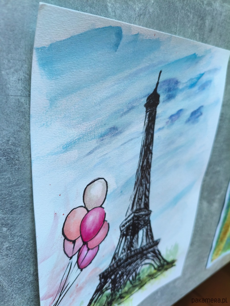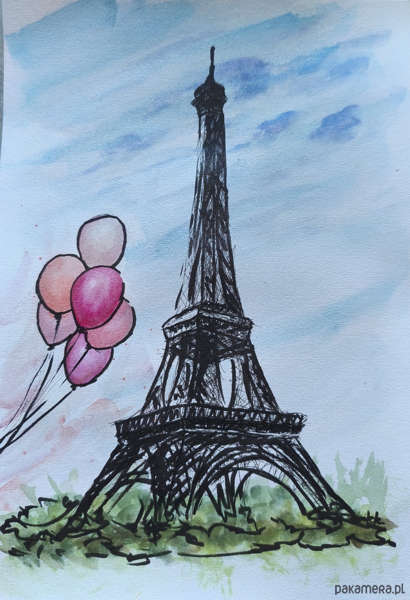 Kompozycja i kolory: Obraz przedstawia ikoniczną Wieżę Eiffla, narysowaną z misterną dbałością o detale jej ażurowej konstrukcji. U jej podstawy widoczne są zielone akcenty, sugerujące parkową przestrzeń. Niebo jest lekko zachmurzone, z delikatnymi, błękitnymi obłoczkami. Uroczy dodatek stanowią unoszące się obok Wieży różowe i czerwone balony, które wprowadzają lekkość, romantyzm i bajkowy nastrój do miejskiego krajobrazu.