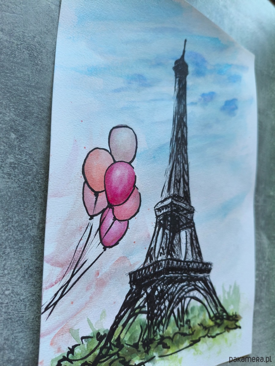 Paryż Francja wieża Eiffla miasta akwarela obraz balony pejzaż miejski 21x30