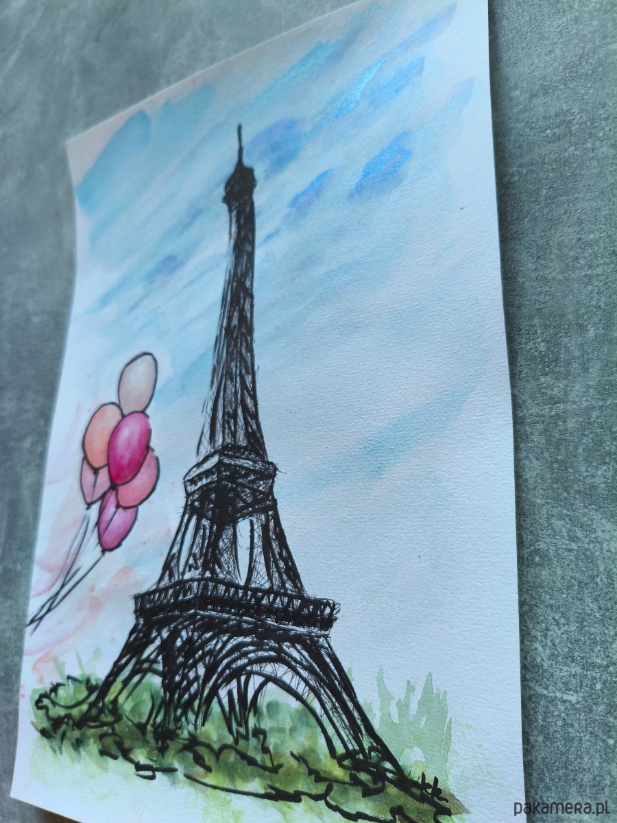 To wyjątkowe dzieło sztuki, "Paryż", wykonane w technice akwareli na formacie A4 (około 21x29.7 cm) z dodatkiem farb akwarelowych metalizowanych, które nadają obrazowi subtelnego blasku.
