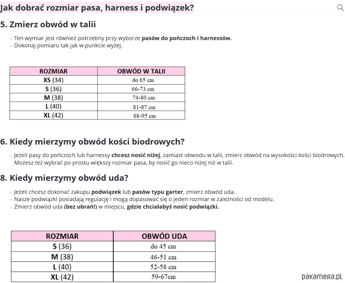 - Naszą rozmiarówkę oraz instrukcję jak dobrać rozmiar pasa - jednak jeśli nie jesteś pewna napisz do nas, a pomożemy ci go dopasować.