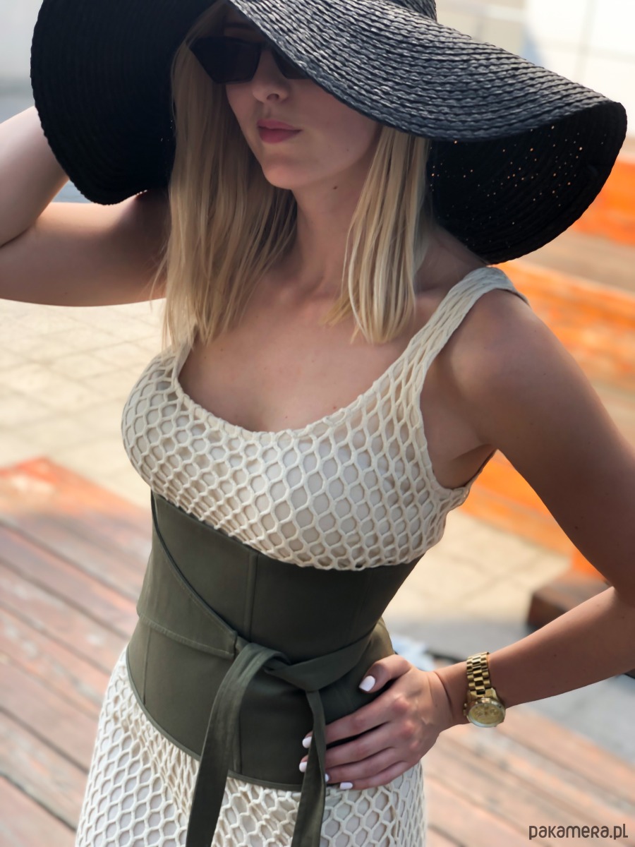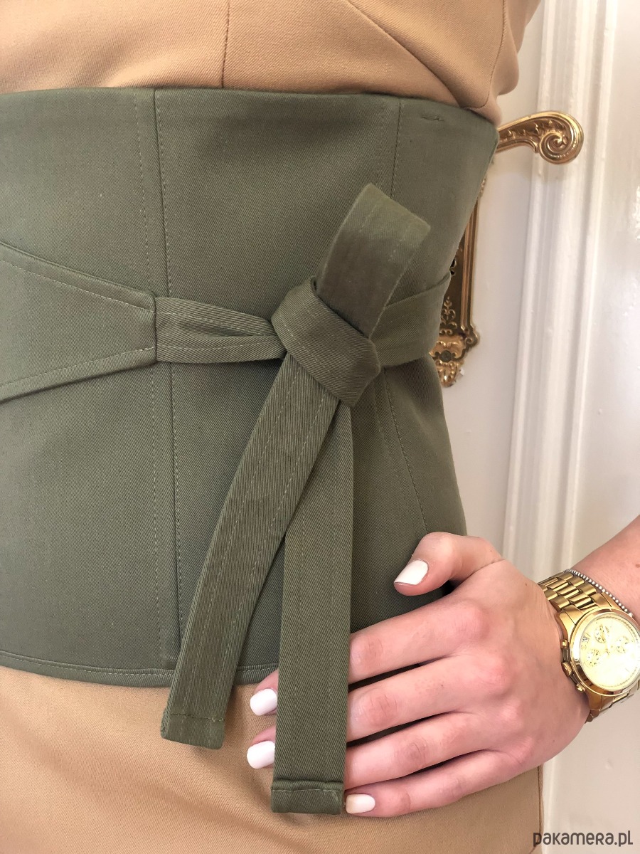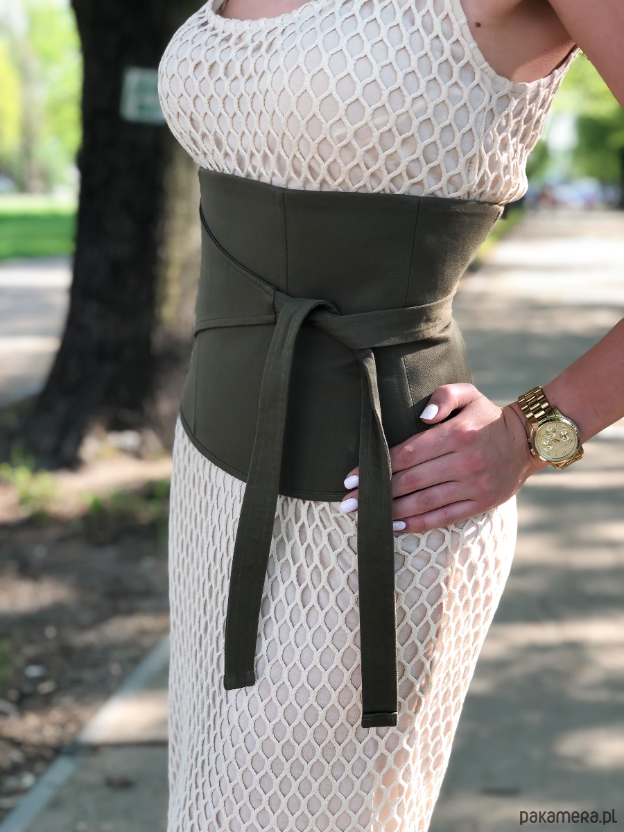 Pas gorsetowy Patricia jest wyjątkowym uzupełnieniem stylizacji. Dostępny jest w trzech kolorach: khaki, piaskowym oraz czarnym. Pięknie podkreśla talię co możliwe jest dzięki metalowym fiszbinom wewnątrz pasa. Z tyłu znajduje się suwak, który ułatwia jego zakładanie.