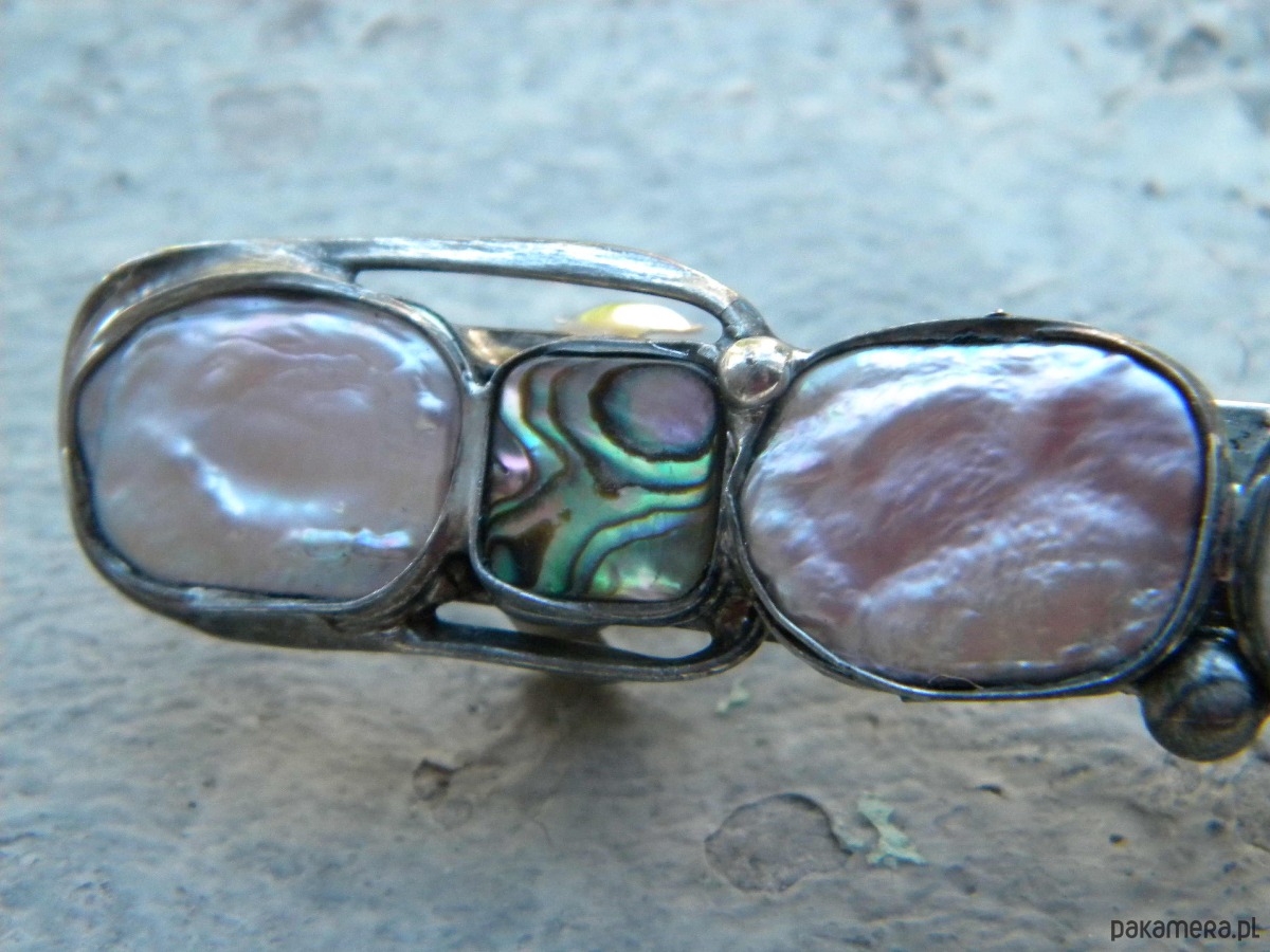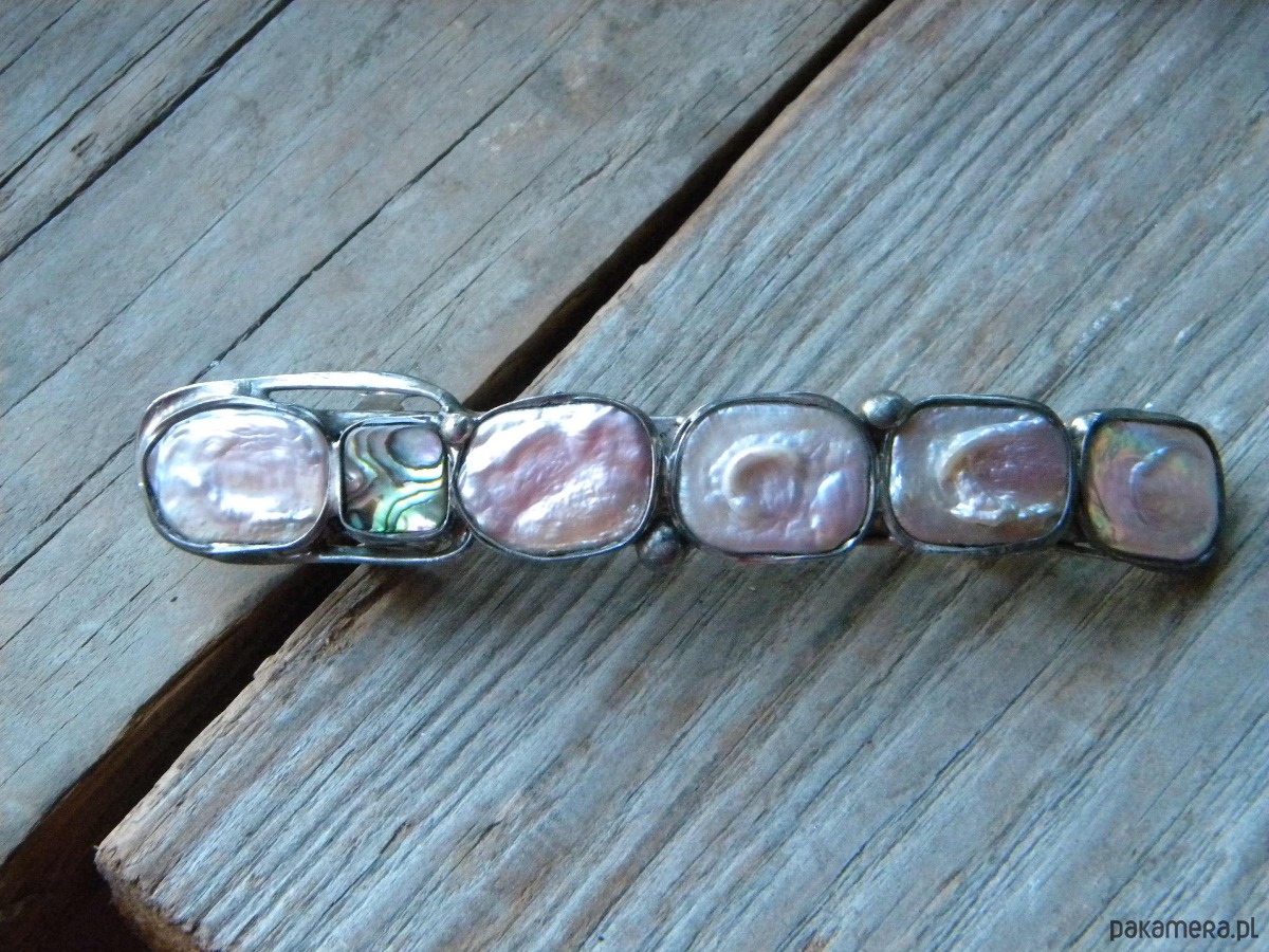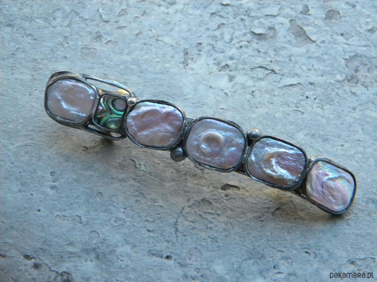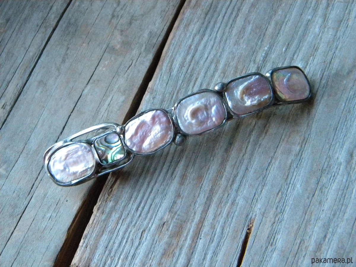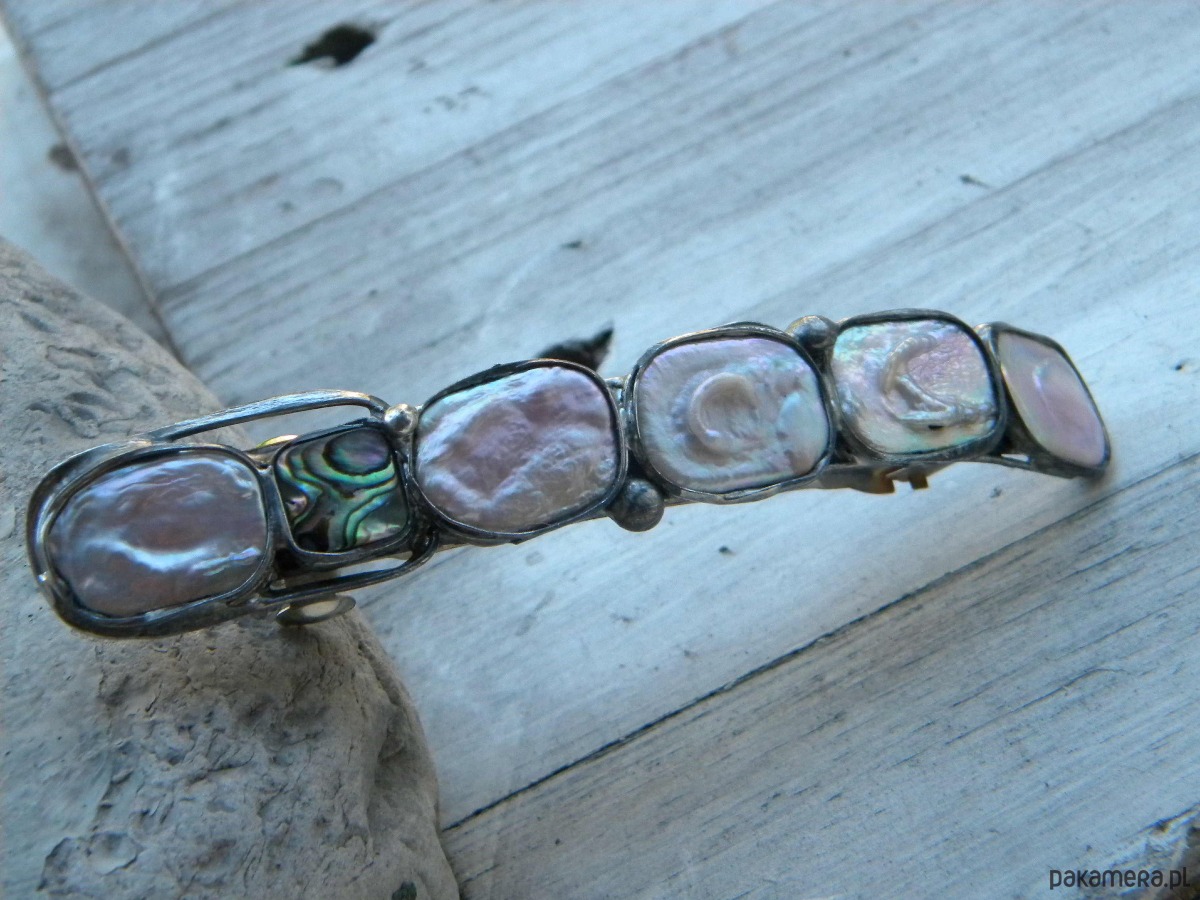 klamra do włosów z białych pereł i muszli paua w ocynowanej miedzi.