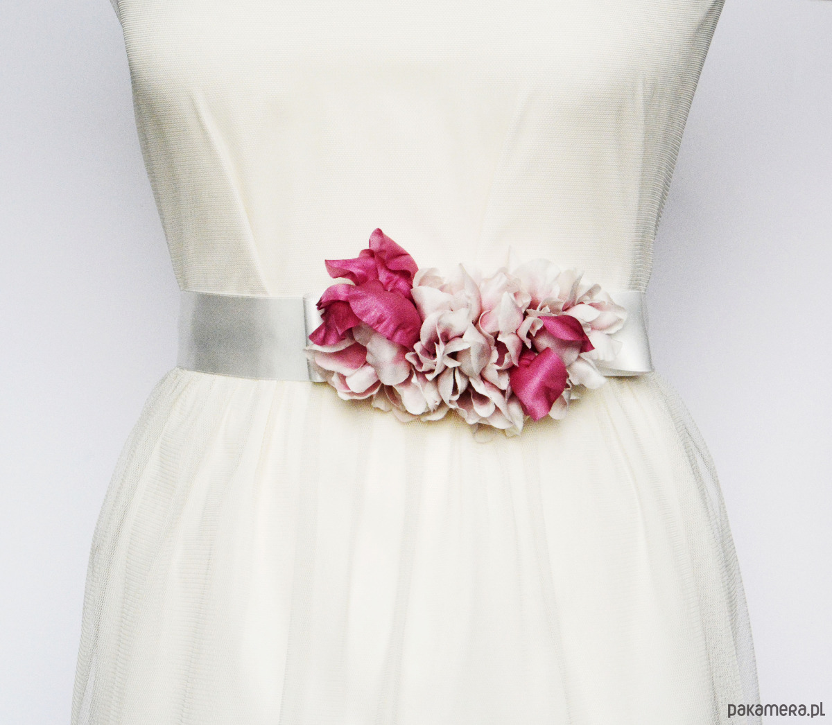 Unikatowy pas ślubny wykonany jest z wysokiej jakości satynowej szarfy, ozdobiony ręcznie malowanymi kwiatami. Każdy płatek jest ręcznie wycinany i formowany specjalnymi narzędziami. Pas może też być noszony jako ozdoba na głowę.