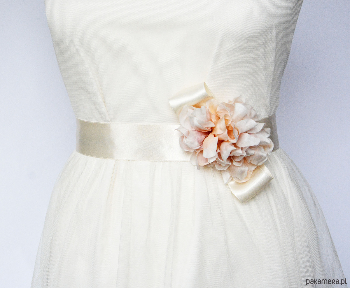 Unikatowy pas ślubny wykonany jest z wysokiej jakości satynowej szarfy w kremowym kolorze.
