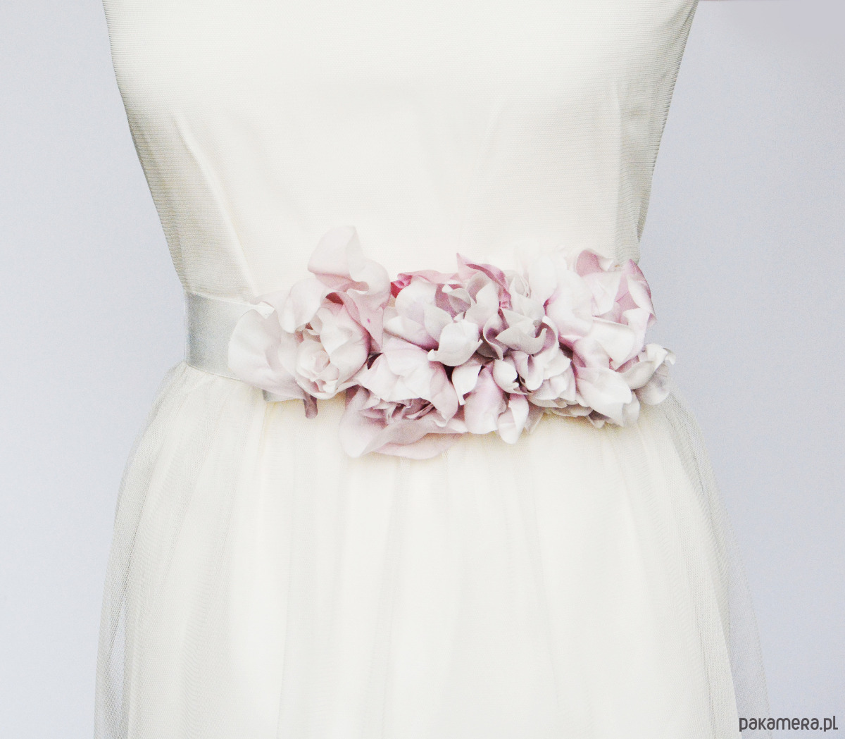 Unikatowy pas ślubny wykonany jest z wysokiej jakości satynowej szarfy, ozdobiony ręcznie malowanymi kwiatami w kolorze bieli i brudnego różu. Każdy płatek jest ręcznie wycinany i formowany specjalnymi narzędziami. Pas może też być noszony jako ozdoba na głowę.