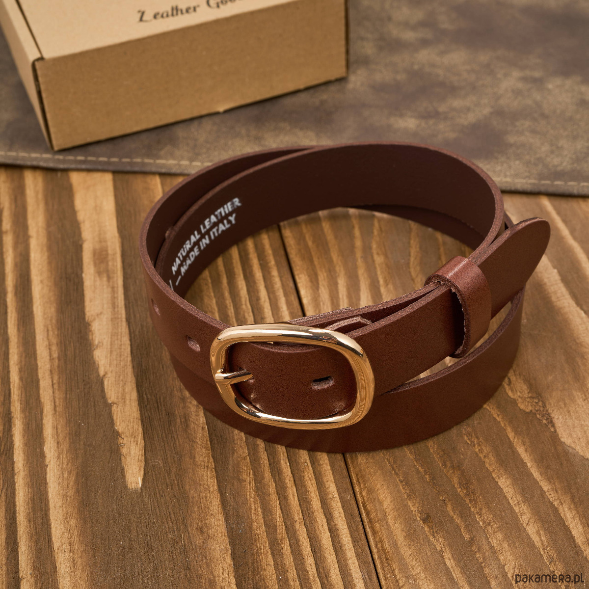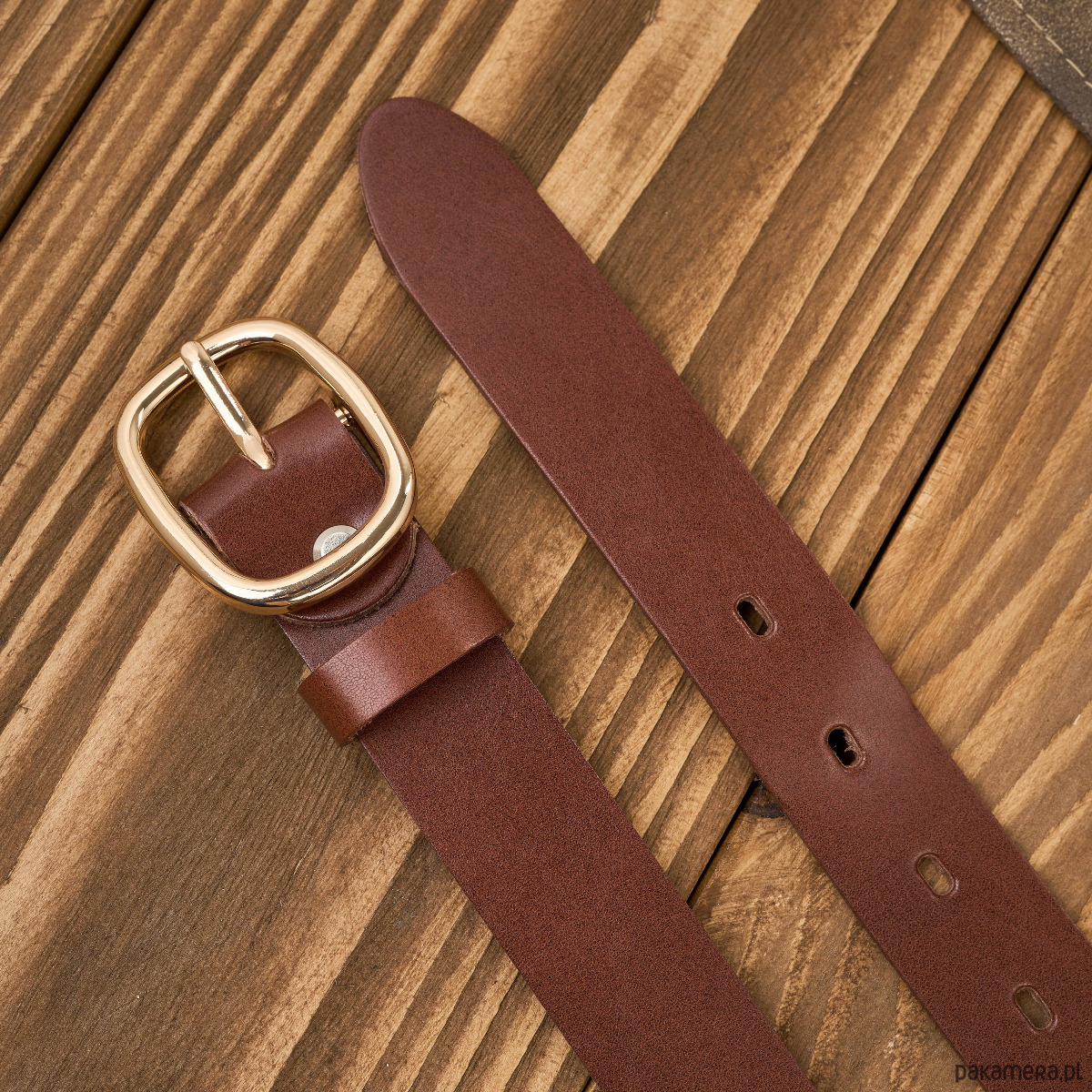 Skórzany pasek damski ciemno brązowy ze złotą klamrą - klasyczna elegancja w modnym wydaniu