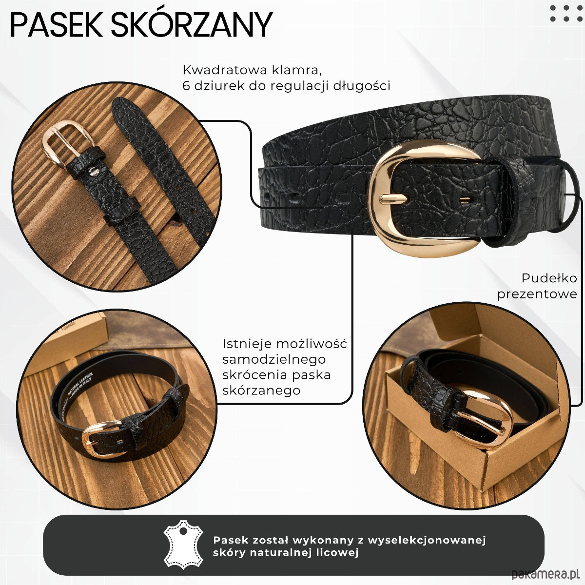 Ten model paska damskiego to propozycja dla kobiet, które lubią bawić się modą! Pasek został wykonany z wytrzymałej skóry naturalnej z widocznym przetłoczeniami imitującymi skórę krokodyla. To świetna propozycja dla kobiet, które lubią się wyróżnić i podkreślić swoje stylizacje niebanalnymi dodatkami skórzanymi.