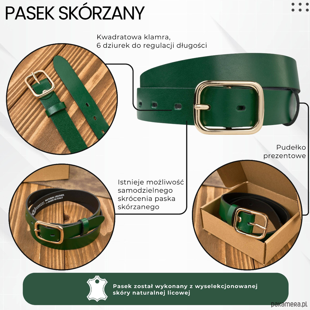 Pasek jest wykonany z wysokogatunkowej skóry naturalnej licowej, dzięki czemu jest trwały, estetyczny i odporny na odkształcenia.