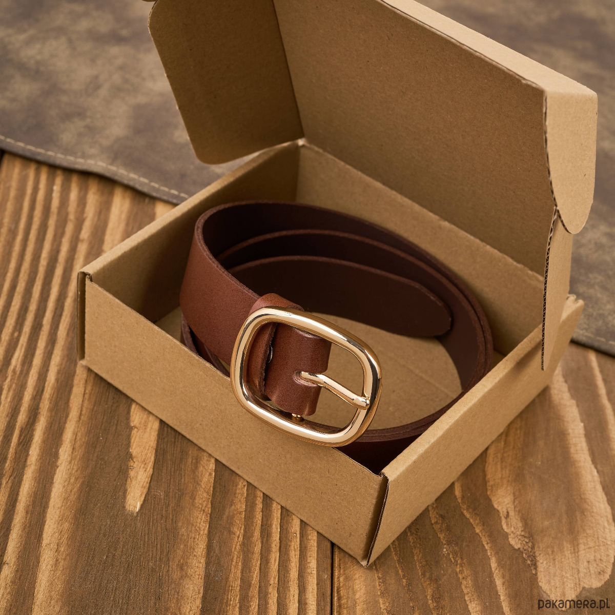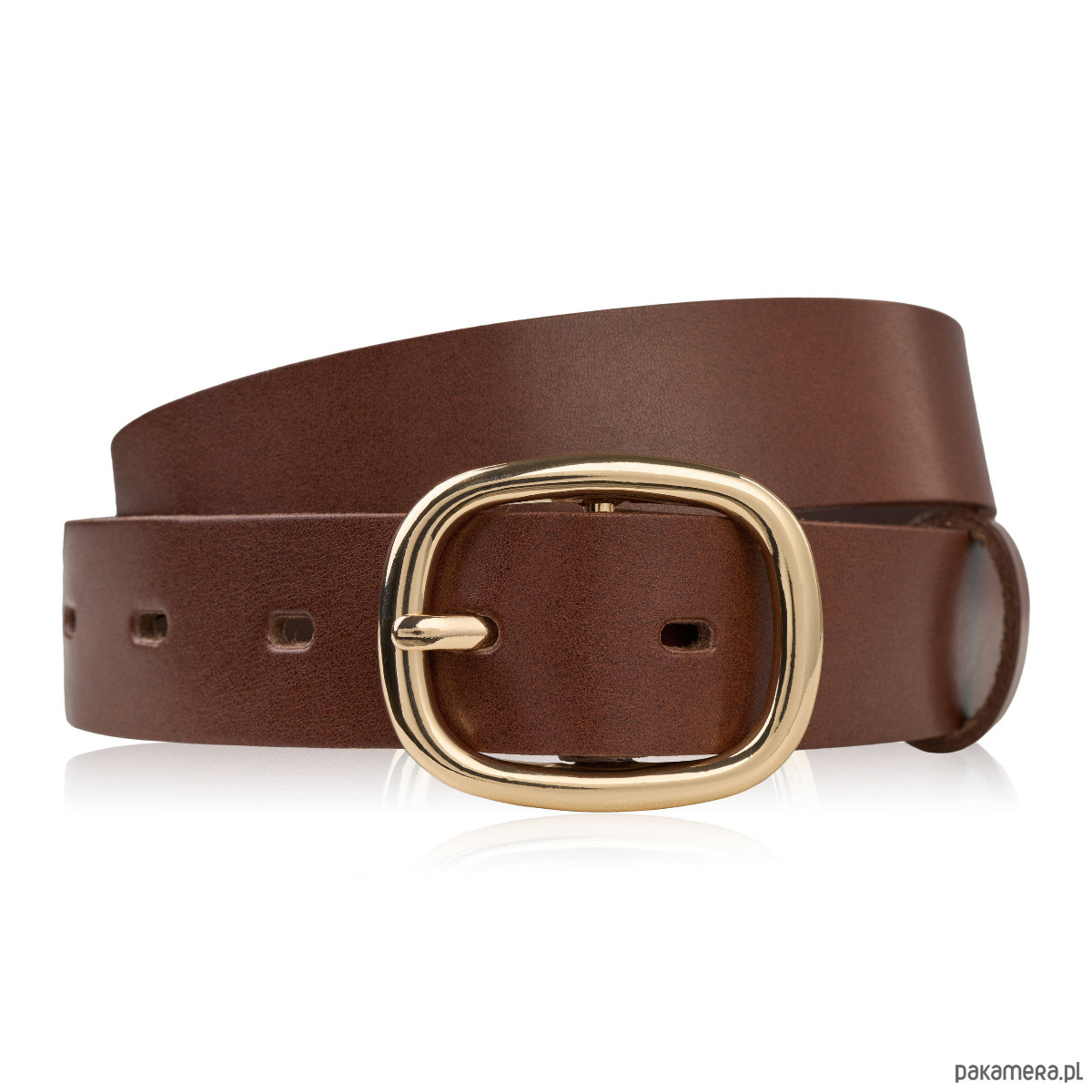 Skórzany pasek damski ciemno brązowy ze złotą klamrą - klasyczna elegancja w modnym wydaniu