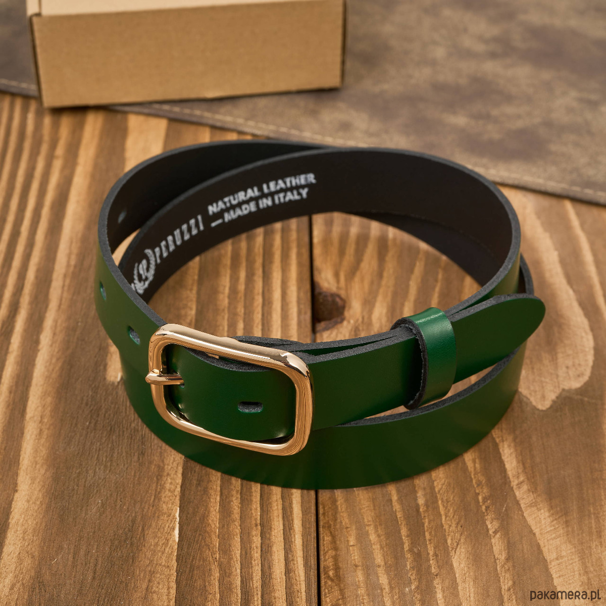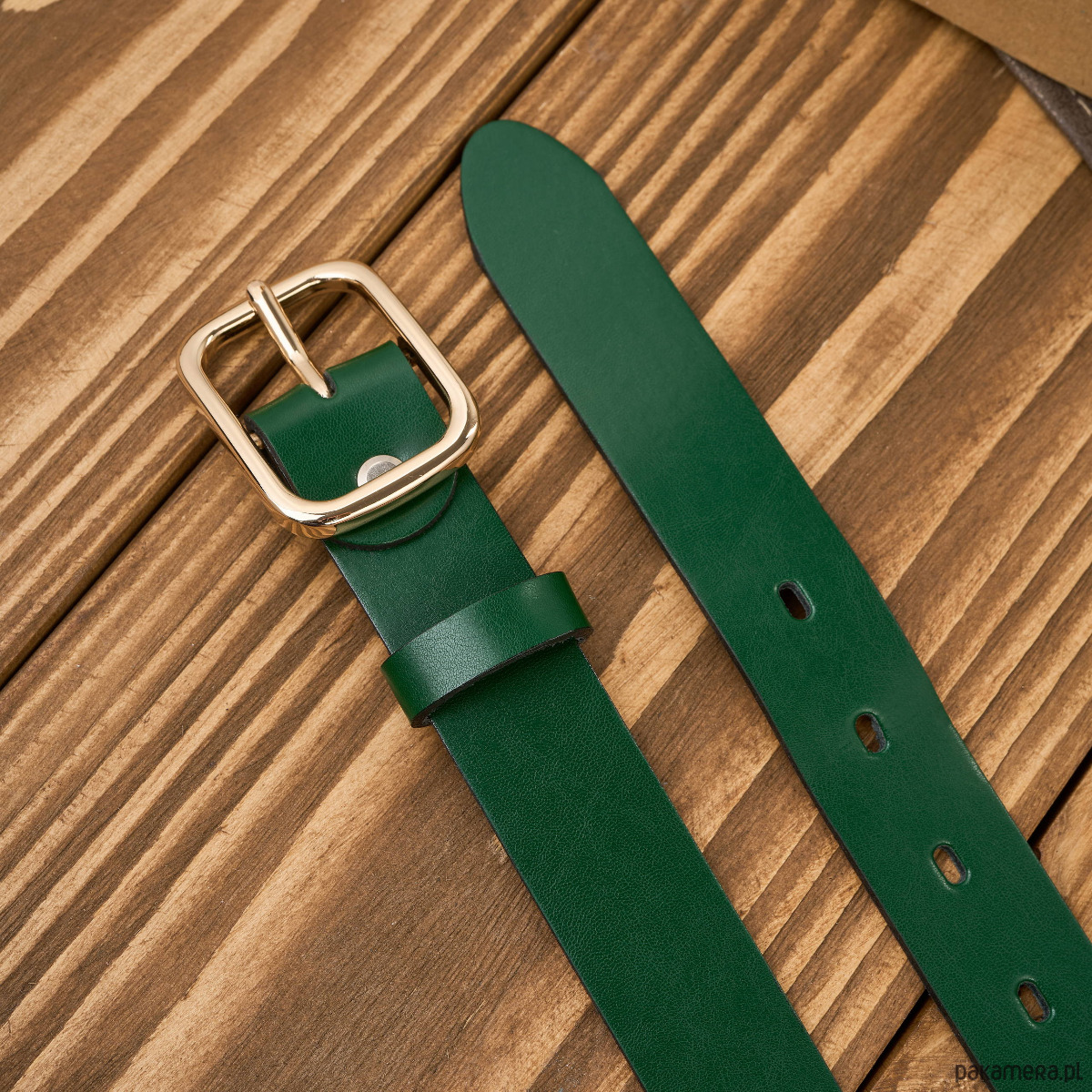 Skórzany pasek damski zielony z elegancką złotą klamrą – modny akcent do codziennych i eleganckich stylizacji