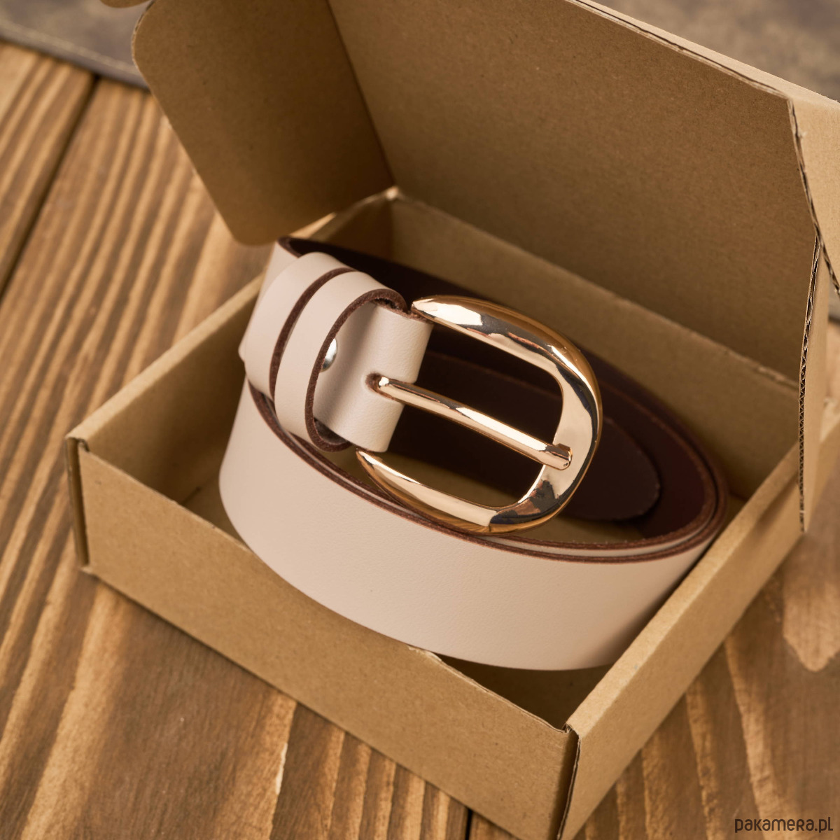 Model wyposażono w piękną, połyskującą klamrę w złotym kolorze — detal, który dodaje luksusowego charakteru i doskonale współgra z jasną barwą paska. To idealny pasek do spodni, jeansów, materiałowych cygaretek czy nawet sukienek wymagających lekkiego podkreślenia talii.
