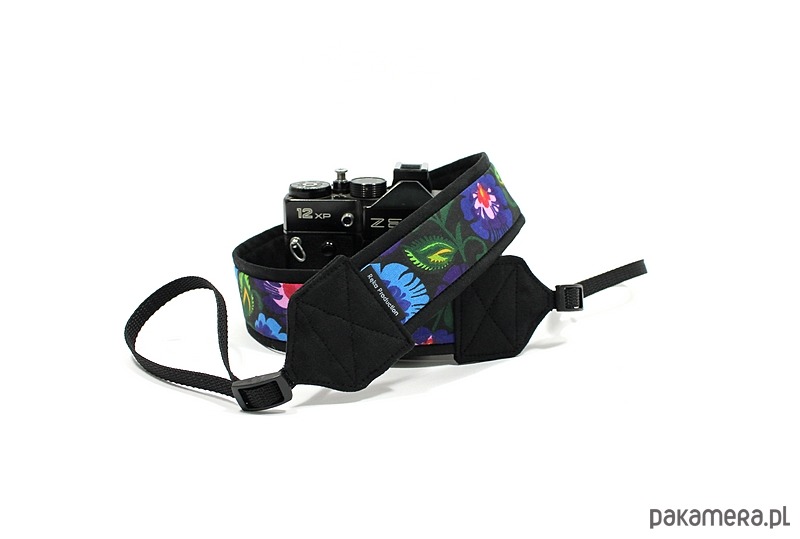 Pasek do aparatu fotogoraficznego uszyty z eko zamszu alkantara w kolorze czarnym i bawełny w piękny folkowy wzór na czarnym tle. Ułożenie wzoru może troszkę różnić się na każdym pasku.