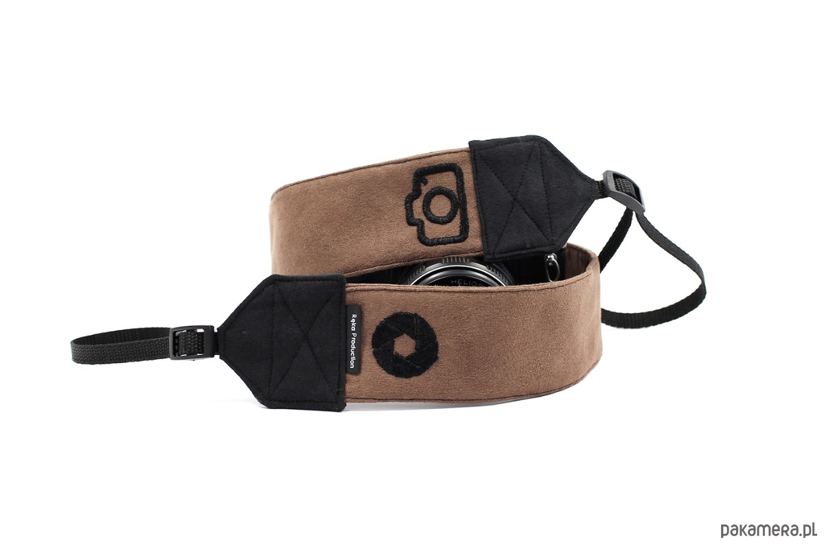 Pasek dla fotografa do aparatu fotograficznego noszonego na szyi lub na ramieniu uszyty obustronnie z jasnobrązowego eko zamszu alkantara. Ozdobiony czarnymi haftami, aparacikiem i migawką. W środku usztywniony flizeliną. Jest giętki i ładnie się układa, gdy dla wygody owiniesz go sobie wokół ręki. Pasek jest przyjemny w noszeniu, nie obciera i nie podrażnia skóry na szyi. Został wyposażony w plastikowe ramki, dzięki którym możesz swobodnie przypiąć pasek do aparatu i dowolnie regulować jego długość. Pasek pasuje do każdego aparatu posiadającego mocowanie o szerokości co najmniej 1 cm.