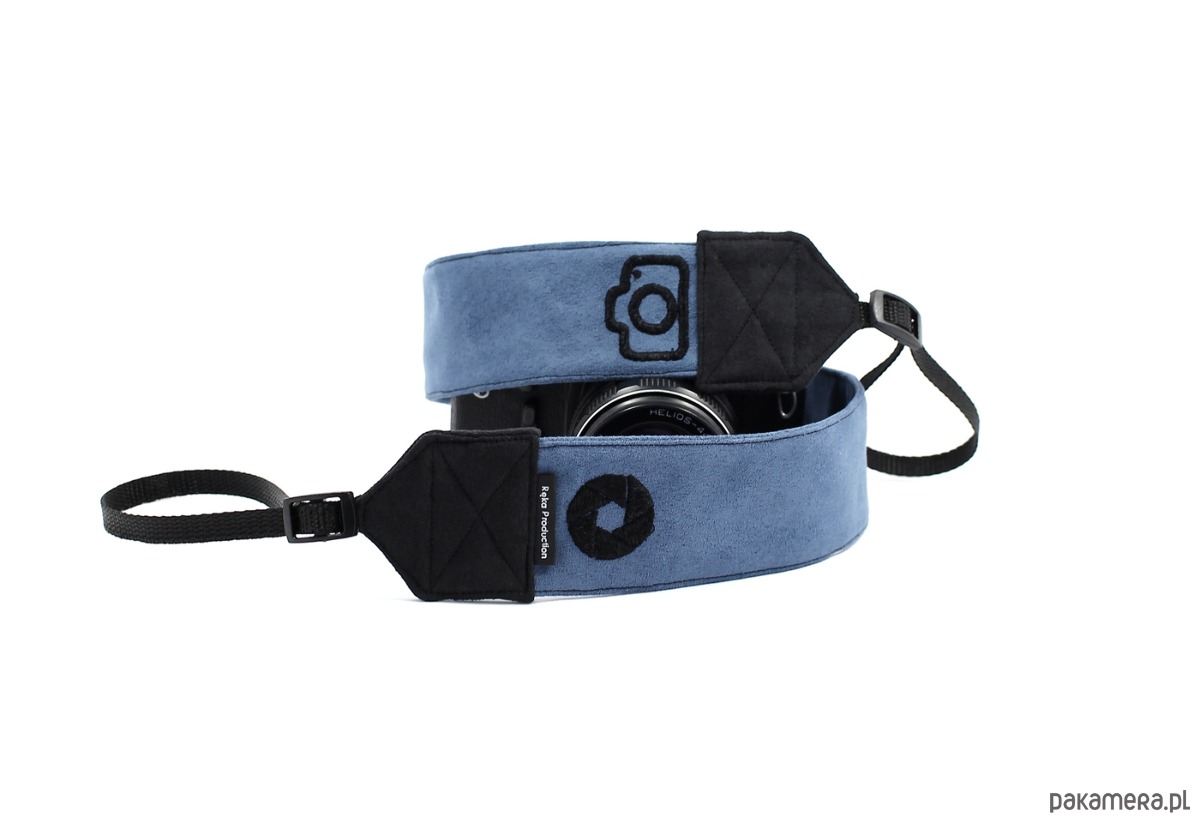 Pasek dla fotografa do aparatu fotograficznego noszonego na szyi lub na ramieniu uszyty obustronnie z jeansowego eko zamszu alkantara. Ozdobiony czarnymi haftami, aparacikiem i migawką. W środku usztywniony flizeliną. Jest giętki i ładnie się układa, gdy dla wygody owiniesz go sobie wokół ręki. Pasek jest przyjemny w noszeniu, nie obciera i nie podrażnia skóry na szyi. Został wyposażony w plastikowe ramki, dzięki którym możesz swobodnie przypiąć pasek do aparatu i dowolnie regulować jego długość. Pasek pasuje do każdego aparatu posiadającego mocowanie o szerokości co najmniej 1 cm.