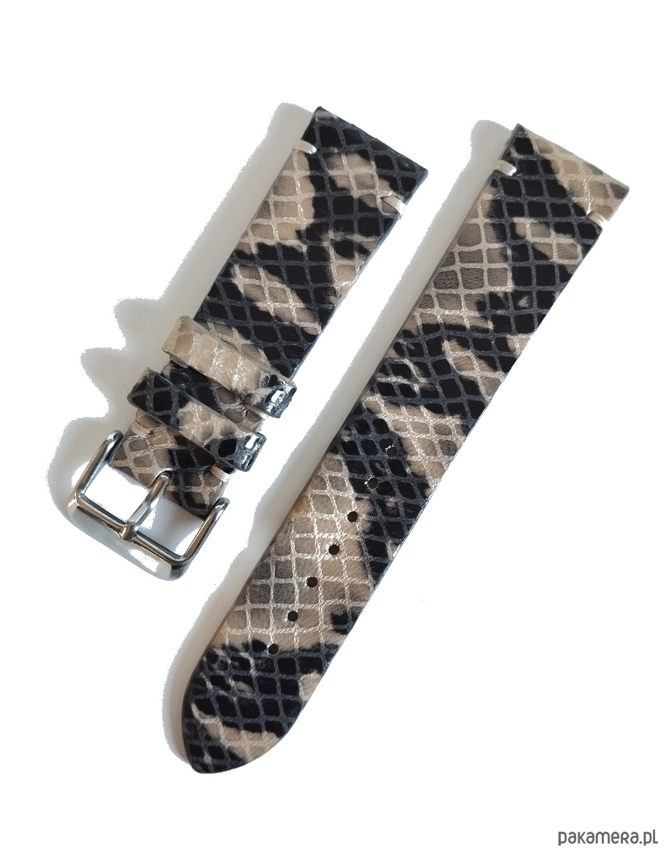 Pasek wykonany z wysokiej jakości naturalnej skóry w beżowo czarnym kolorze o fakturze tłoczonego węża . Pasek szyty nicią dobraną do koloru skóry. Brzegi paska malowane w kolorze skóry. Faktura skóry może się minimalnie różnić od prezentowanego na zdjęciu , ponieważ może być wykonany z innego kawałka tej samej skóry. Pasek wykonany w całości ręcznie przy użyciu tradycyjnych metod , szycie , malowanie brzegów , zgodne z tradycyjną sztuką rzemieślniczą . Połączenie szlachetnej skóry ze szczególną dbałością wykonania wyróżnia nasze paski na tle innych. Każdy pasek wykonany jest jako pojedynczy egzemplarz , więc jeśli szukasz czegoś wyjątkowego to nasz pasek jest odpowiednim wyborem dla Ciebie . Ciekawy pasek dobrany do zegarka zawsze poprawi efekt wizualny całego zestawu. Więcej ofert na naszej stronie Lamato , Zapraszamy