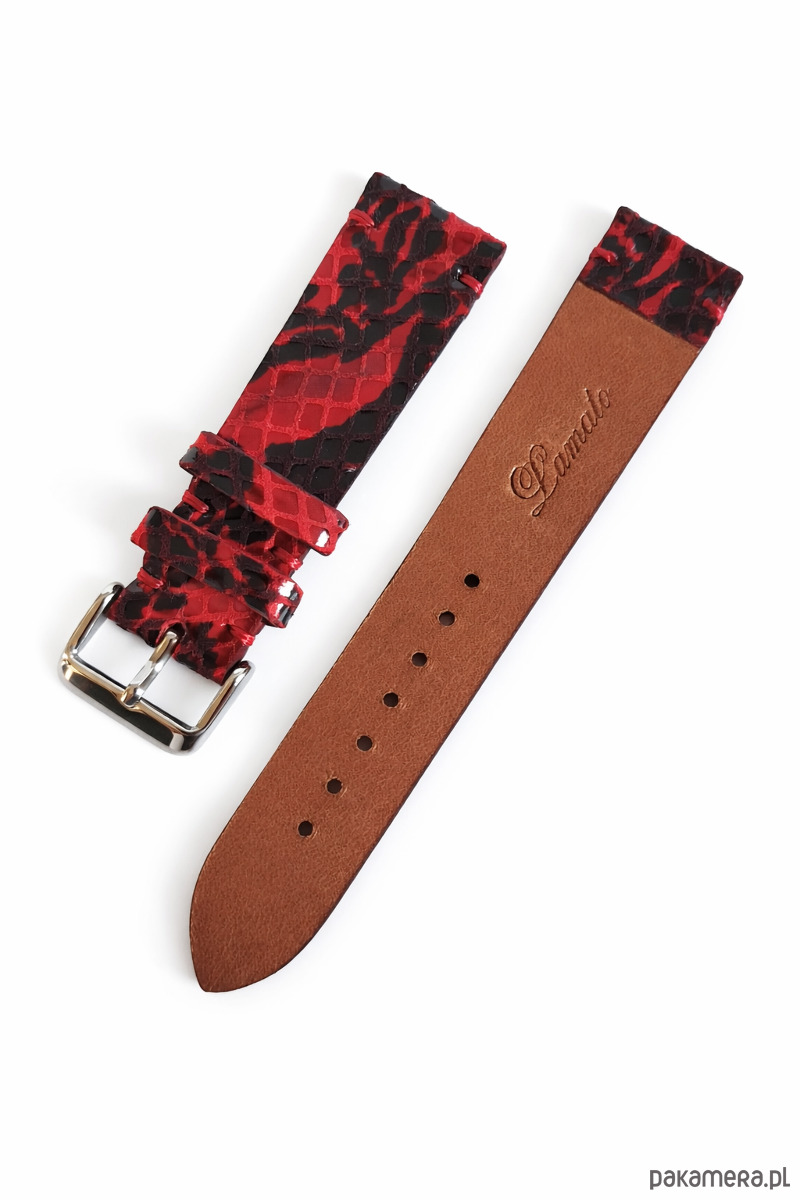 Pasek wykonany z wysokiej jakości naturalnej skóry w czerwono czarnym kolorze o fakturze tłoczonego węża . Pasek szyty czerwoną nitką . Brzegi paska malowane w kolorze skóry. Faktura skóry może się minimalnie różnić od prezentowanego na zdjęciu , ponieważ może być wykonany z innego kawałka tej samej skóry. Pasek wykonany w całości ręcznie przy użyciu tradycyjnych metod , szycie , malowanie brzegów , zgodne z tradycyjną sztuką rzemieślniczą . Połączenie szlachetnej skóry ze szczególną dbałością wykonania wyróżnia nasze paski na tle innych. Każdy pasek wykonany jest jako pojedynczy egzemplarz , więc jeśli szukasz czegoś wyjątkowego to nasz pasek jest odpowiednim wyborem dla Ciebie . Ciekawy pasek dobrany do zegarka zawsze poprawi efekt wizualny całego zestawu. Więcej ofert na naszej stronie Lamato , Zapraszamy